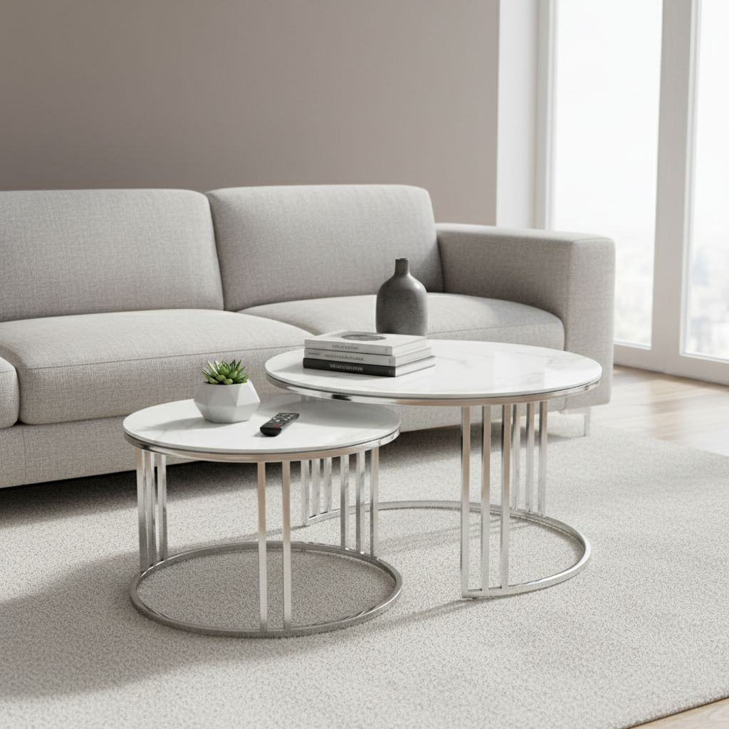 Deska obou stolků je ze skla v dezénu mramoru. Ten spolu s lesklou nerezovou podnoží tvoří svěží celek, který zazáří v každém obýváku či kanceláři.