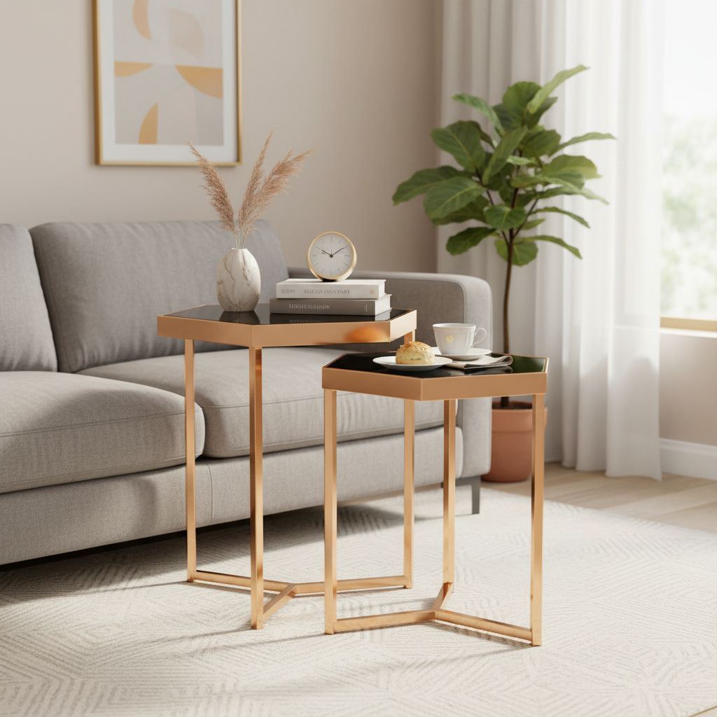 Horní desky stolků jsou vyrobené z tvrzeného skla, které je snadné na údržbu. Kovové podnože napomáhají stabilitě stolkú a tvoří i ozdobnou část designu.