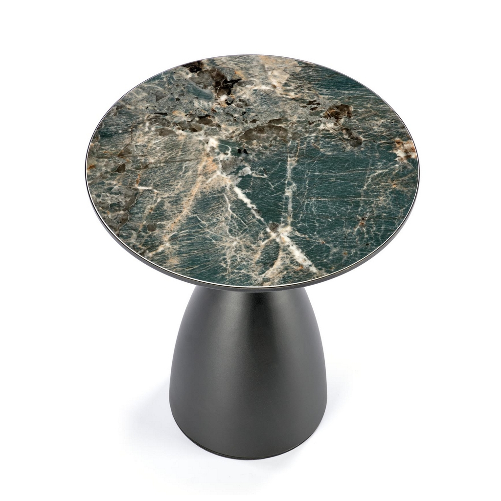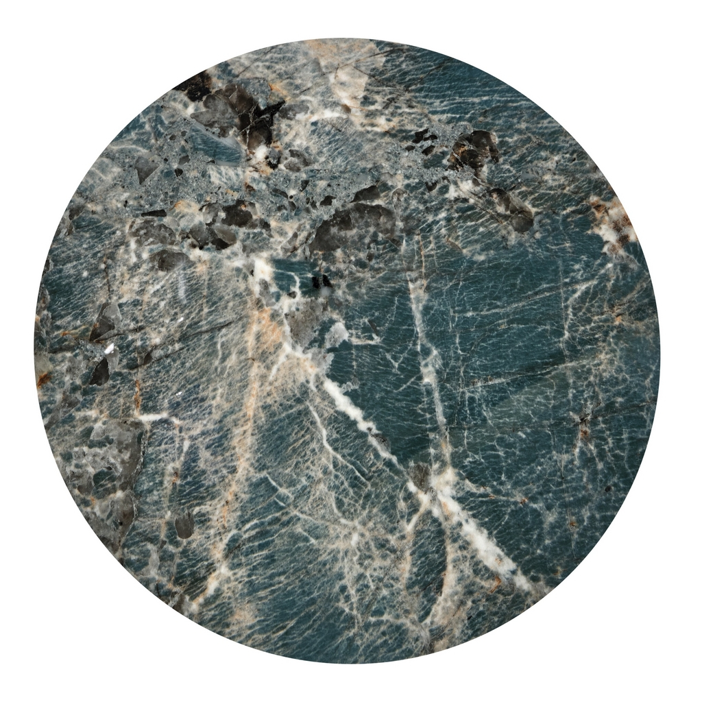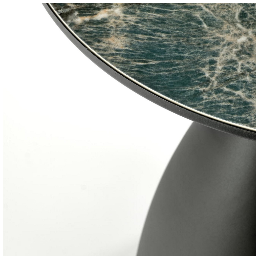 Kruhová deska o průměru 50 cm je z keramiky s unikátní texturou nazelenalého mramoru. Před potlučením ji chrání rám z černé práškované ocele, který volně přechází v nohu stolku.