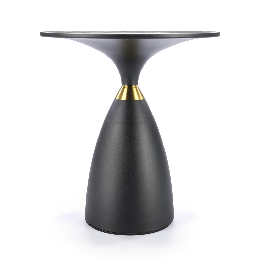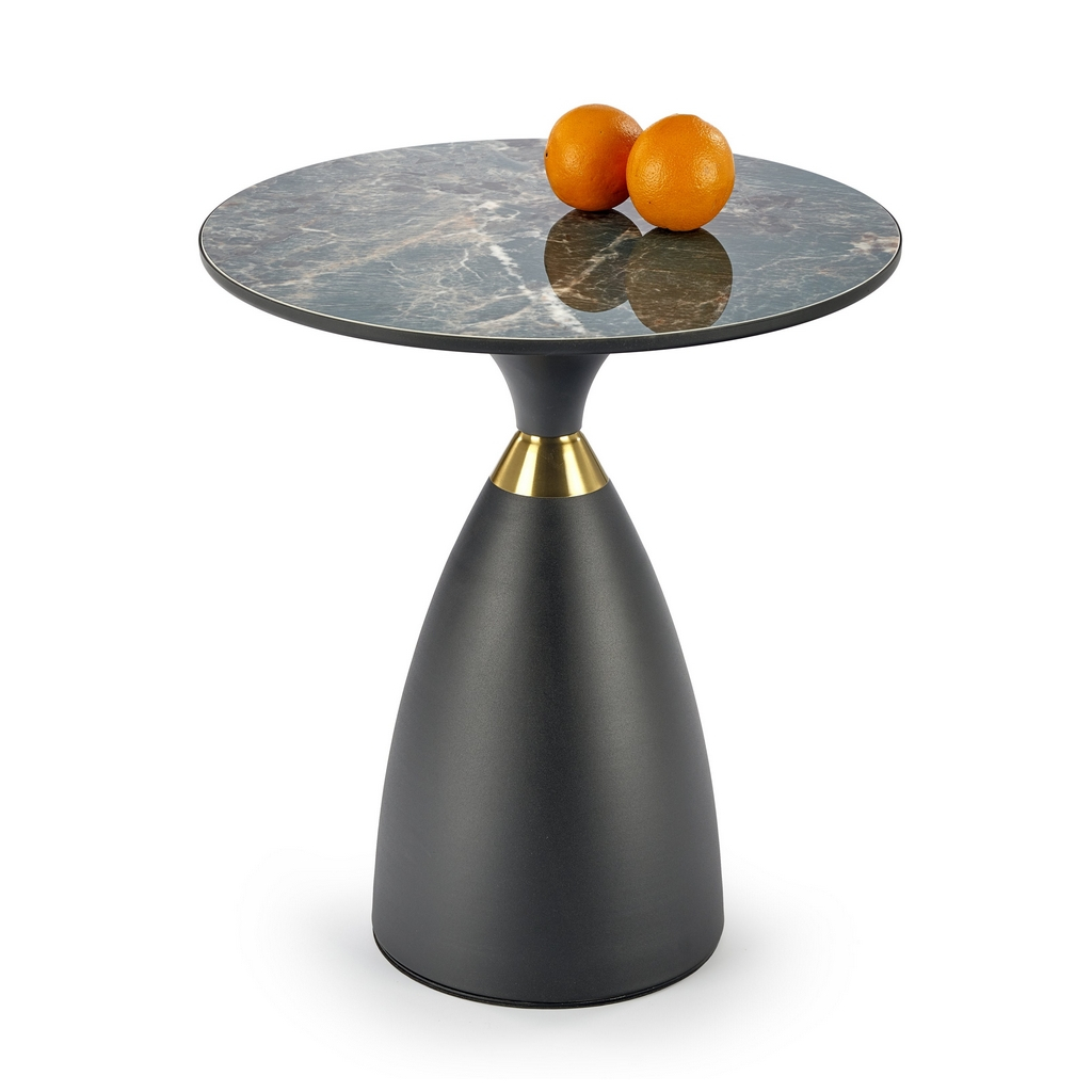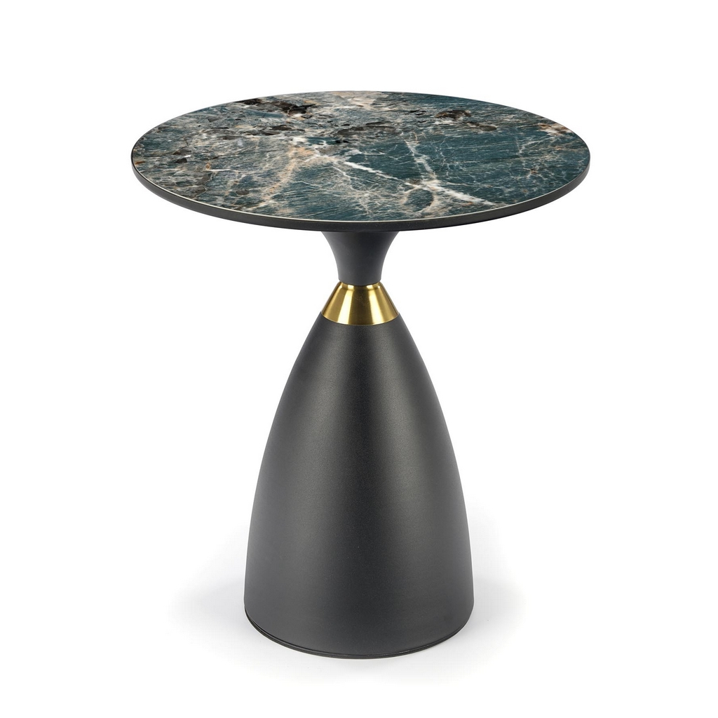 Kruhová deska o průměru 50 cm je z keramiky s unikátní texturou nazelenalého mramoru. Před potlučením ji chrání rám z černé práškované ocele, který volně přechází v nohu stolku.