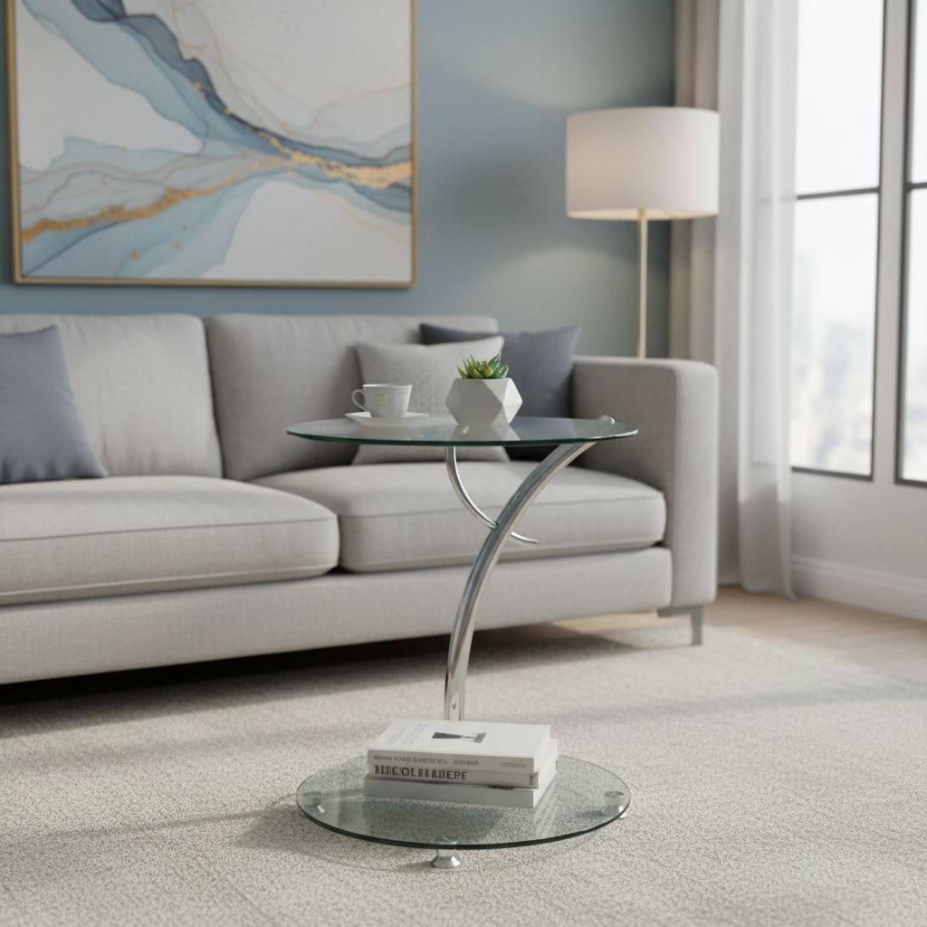 Horní deska stolku je vyrobená z tvrzeného skla, které se dobře čistí a hezky se leskne. Skleněná deska je položená šikmo od konstrukce stolu, čímž dostává neobvyklý a zároveň zajímavý vzhled.