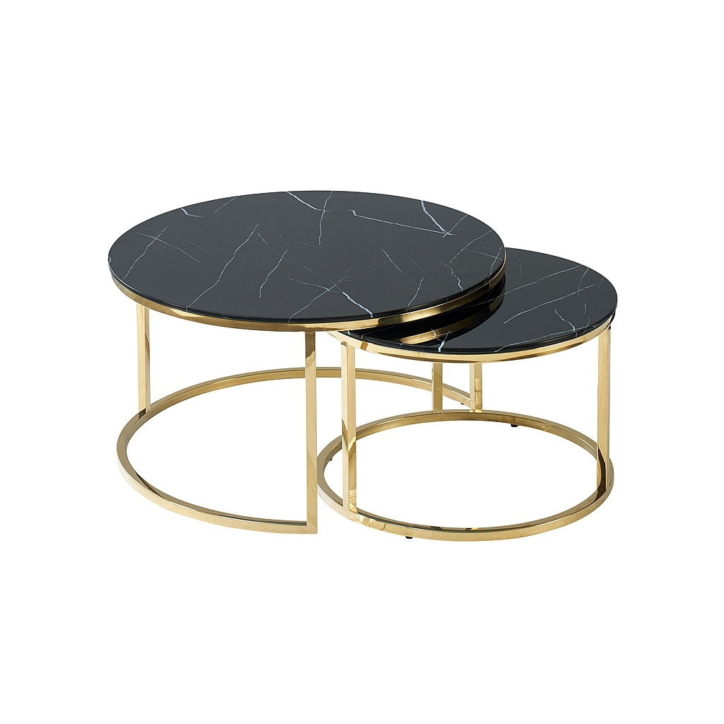 Horní desky stolků jsou vyrobené z tvrzených skel, která svým vzhledem imitují strukturu mramoru.