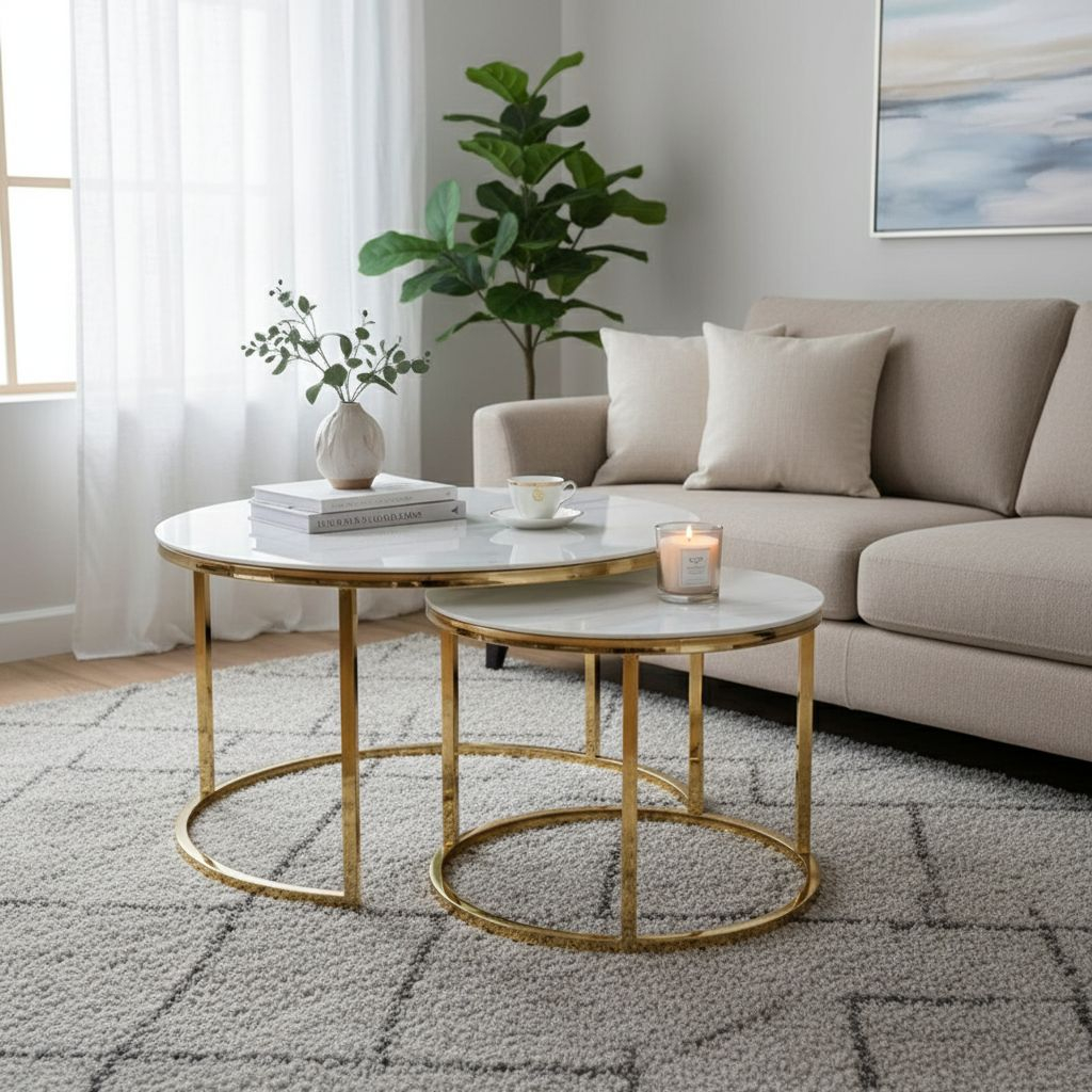 Horní desky stolků jsou vyrobené z tvrzených skel, která svým vzhledem imitují strukturu mramoru.
