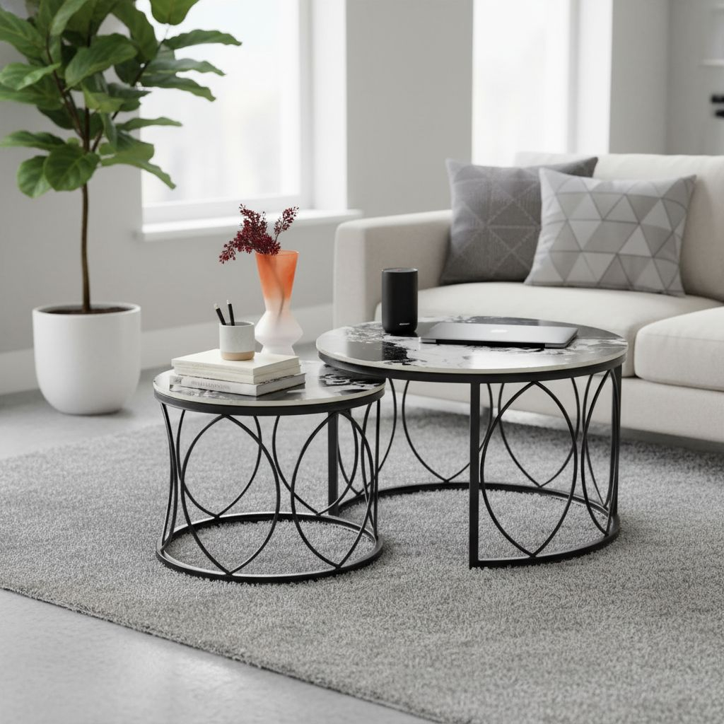 Po designové stránce spolu stolky perfektně ladí – oba mají kruhovou desku z umělého kamene a černou kovovou podnož, kterou zdobí oválné motivy.