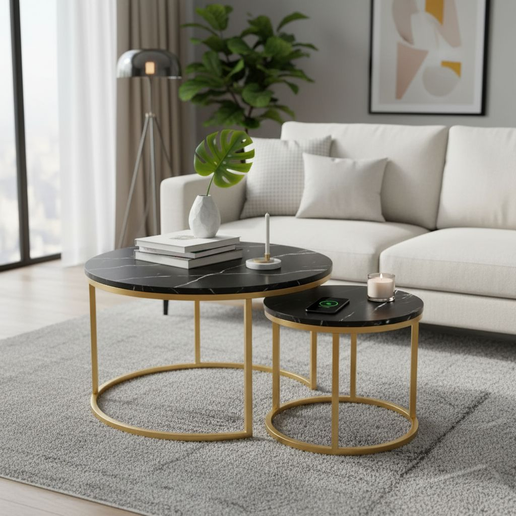 Tato elegantní sada dvou konferenčních stolků je ideální volbou do moderních obývacích pokojů a pracoven. Díky svému provedení je ideální pro milovníky luxusních materiálů a neotřelých designů, které se hodí do současných interiérů.