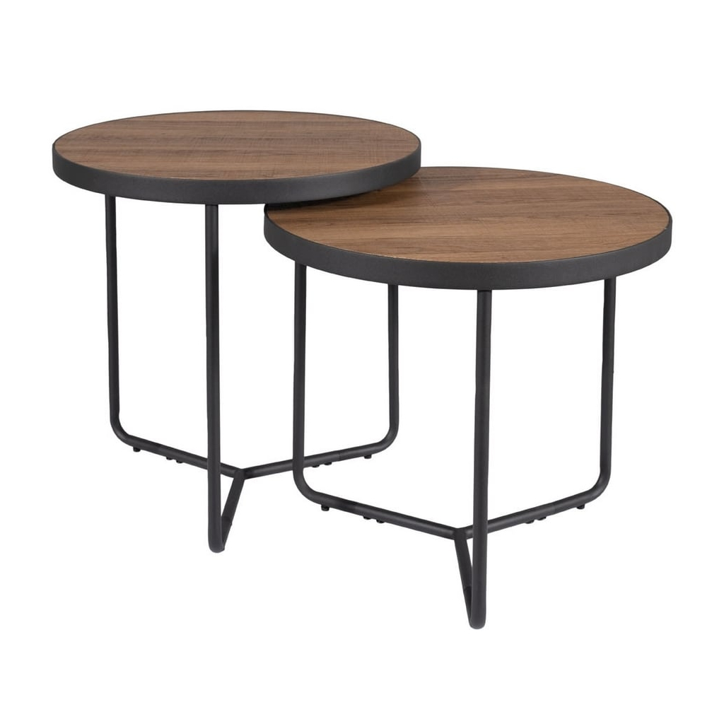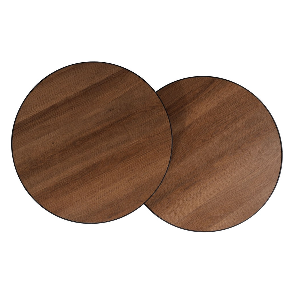 Oba stolky mají kruhovou desku z dýhovaného dřevovlákna (MDF), kterou nesou černé kovové nohy.