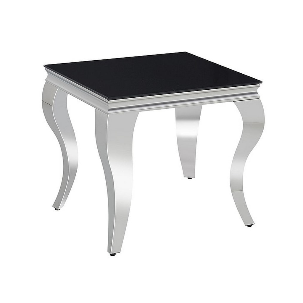 Deska stolku je z neprůhledného tvrzeného skla v černé barvě. To se skvěle doplňuje se stříbrnou kovovou podnoží. Výsledná kombinace evokuje nábytek jako ze šlechtického sídla.