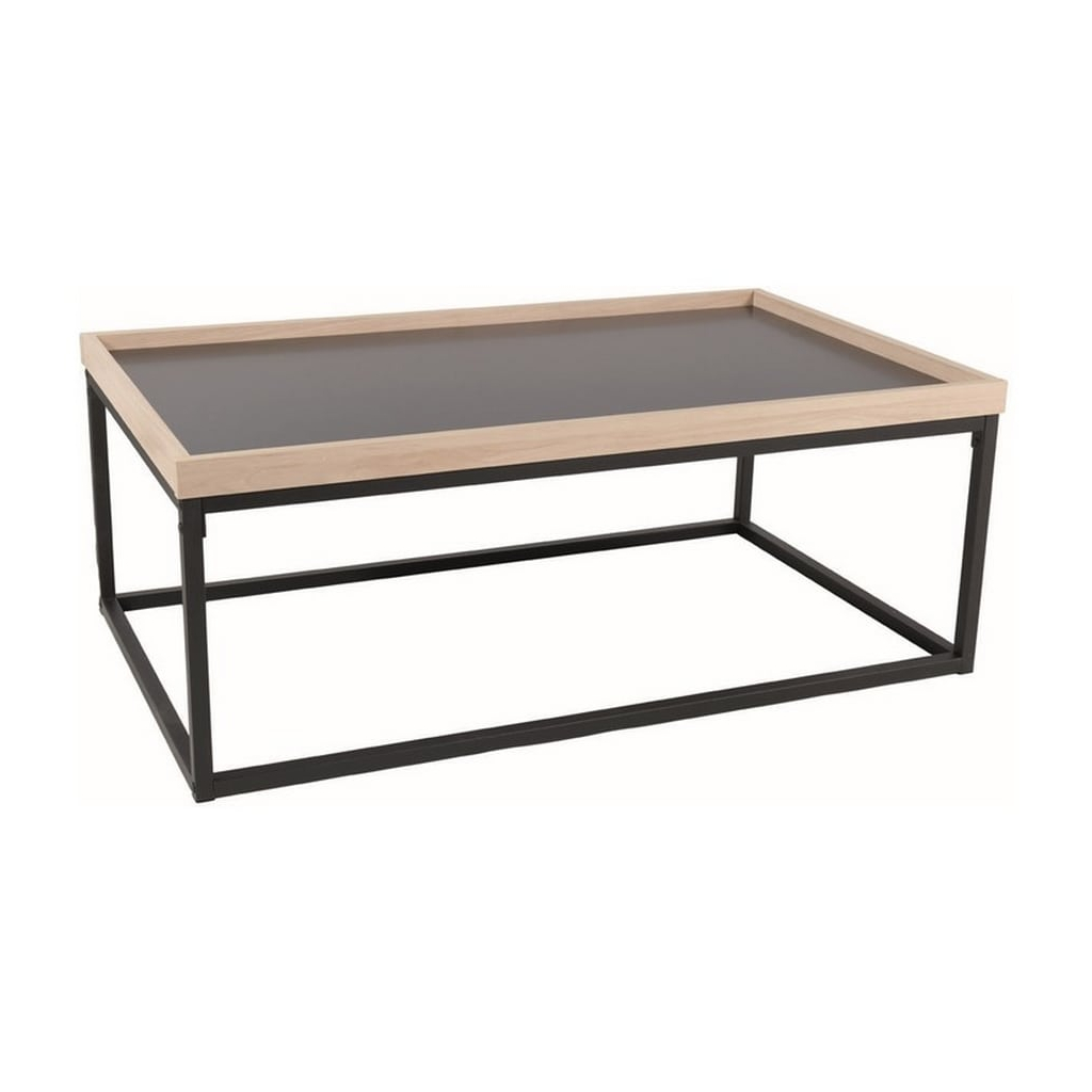 Deska stolku je z laminované dřevotřísky stejně jako praktický rám kolem ní. Ten jednak ozvláštní vzhled stolku, jednak předejde sklouznutí věcí ze stolku na zem. Podnož je pak z černého kovu.