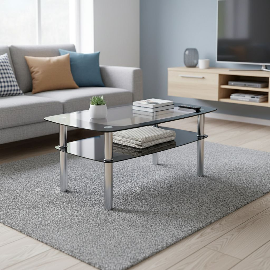 Horní deska je tvořena z tvrzeného skla. Pod poloprůhlednou horní deskou se nachází ještě jedna menší ze zatmaveného skla pro odkládání různých věcí. Nohy stolku jsou pochromované.