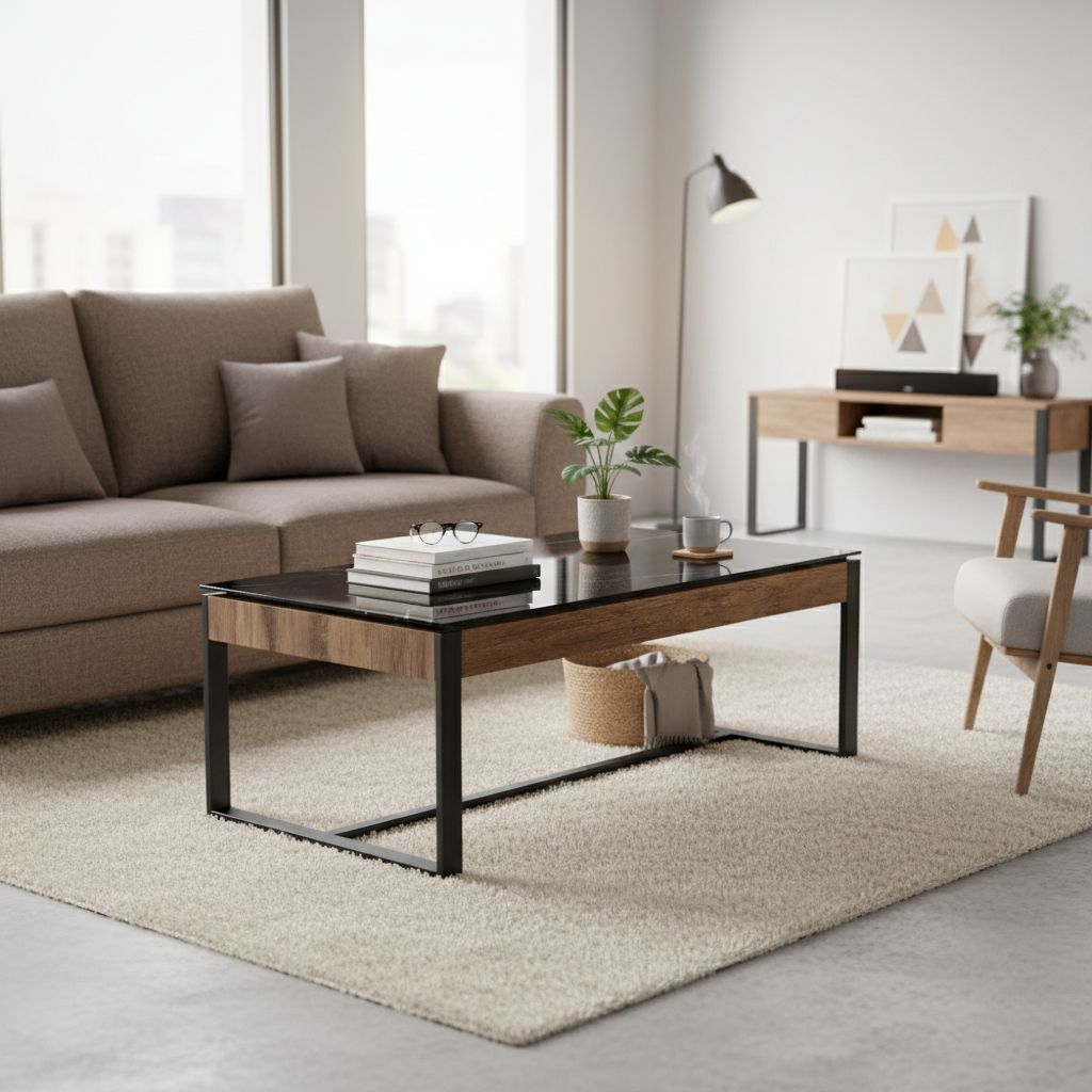 Zbytek stolku pak kombinuje MDF (dřevovláknité desky) v přírodním dezénu s černou práškovanou ocelí. Spojení všech 3 materiálů vytváří vkusný a reprezentativní celek.