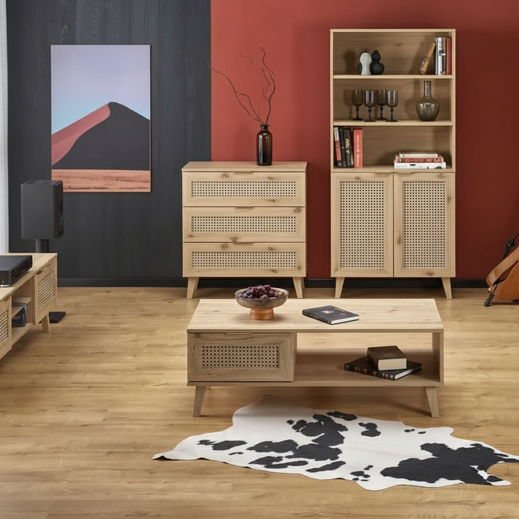Nábytková řada Rustico do vašeho bytu nebo kanceláře vnese svěží přírodní atmosféru. Jednoduchá celodřevěná konstrukce s imitací ratanového úpletu na dvířkách působí exoticky, ale zároveň vkusně – a to jak v moderním interiéru, tak po boku konzervativnějšího dekoru.