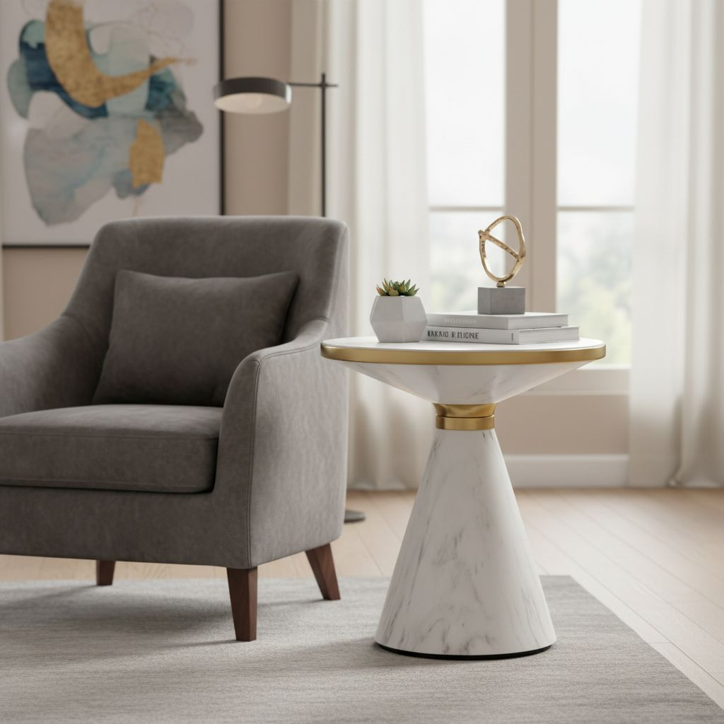 Deska stolku má podobu kruhu z umělého kamene (sintru) o průměru 50 cm. Objímá ji nerezový kužel ve zlaté barvě, který vytváří atraktivní kontrast s bílou barvou zbytku konstrukce.