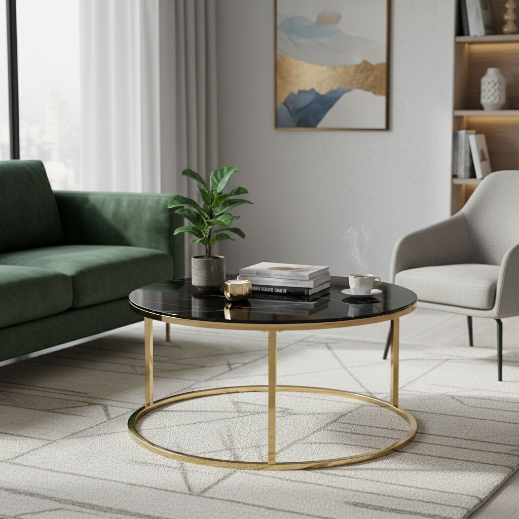 Horní deska stolku je vyrobená z tvrzeného skla v imitaci mramoru a její údržba je snadná. Kovová podnož napomáhá stabilitě stolku a tvoří i ozdobnou část designu.