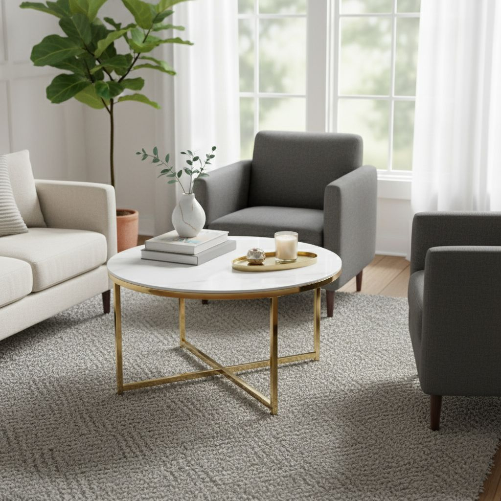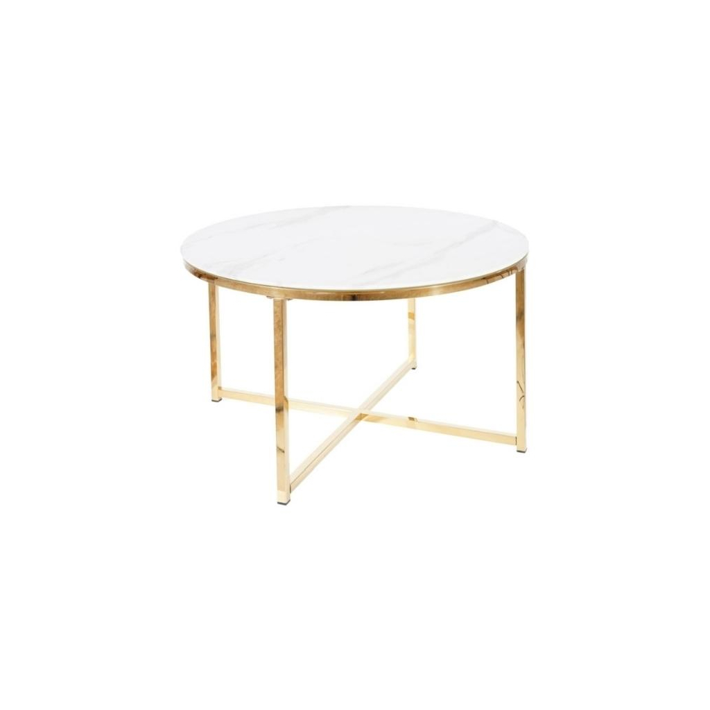 Horní deska stolku je vyrobená z tvrzeného skla v imitaci mramoru a její údržba je snadná. Kovová podnož napomáhá stabilitě stolku a tvoří i ozdobnou část designu.