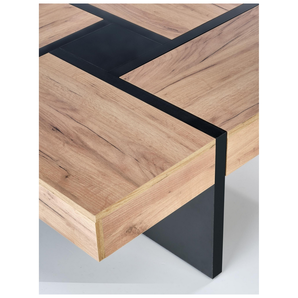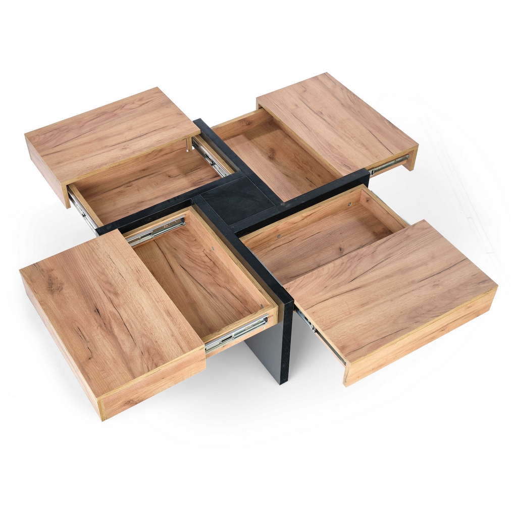 Se zasunutými zásuvkami má stolek čtvercový tvar o délce strany 100 cm, vysoký je 47 cm – ideální k většině pohovek.