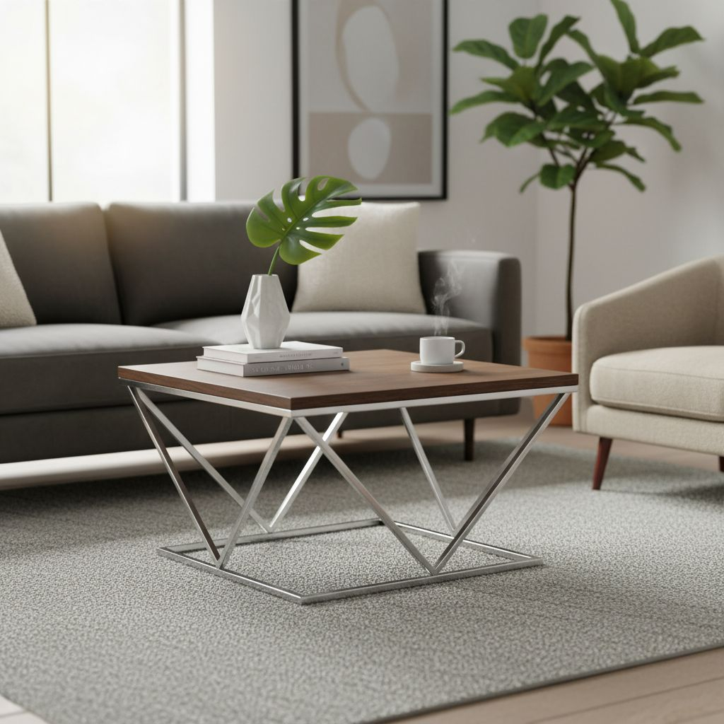 Prostorná čtvercová deska o délce 80 cm z MDF s přírodní dýhou přináší příjemný a teplý vzhled dřeva, který krásně kontrastuje s jemně lesklou kovovou podnoží. Kovový rám se zajímavým geometrickým tvarem dodává stolku lehkost a vzdušnost. Nosnost stolku je 20 kg.