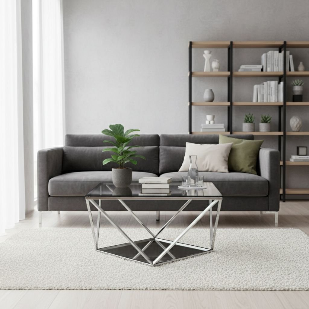 Horní deska je vyrobena z tvrzeného kouřového skla a je doplněna o podnož z oceli v barvě chromu. Podnož má specifický tvar a dodává stolku nadčasový vzhled.