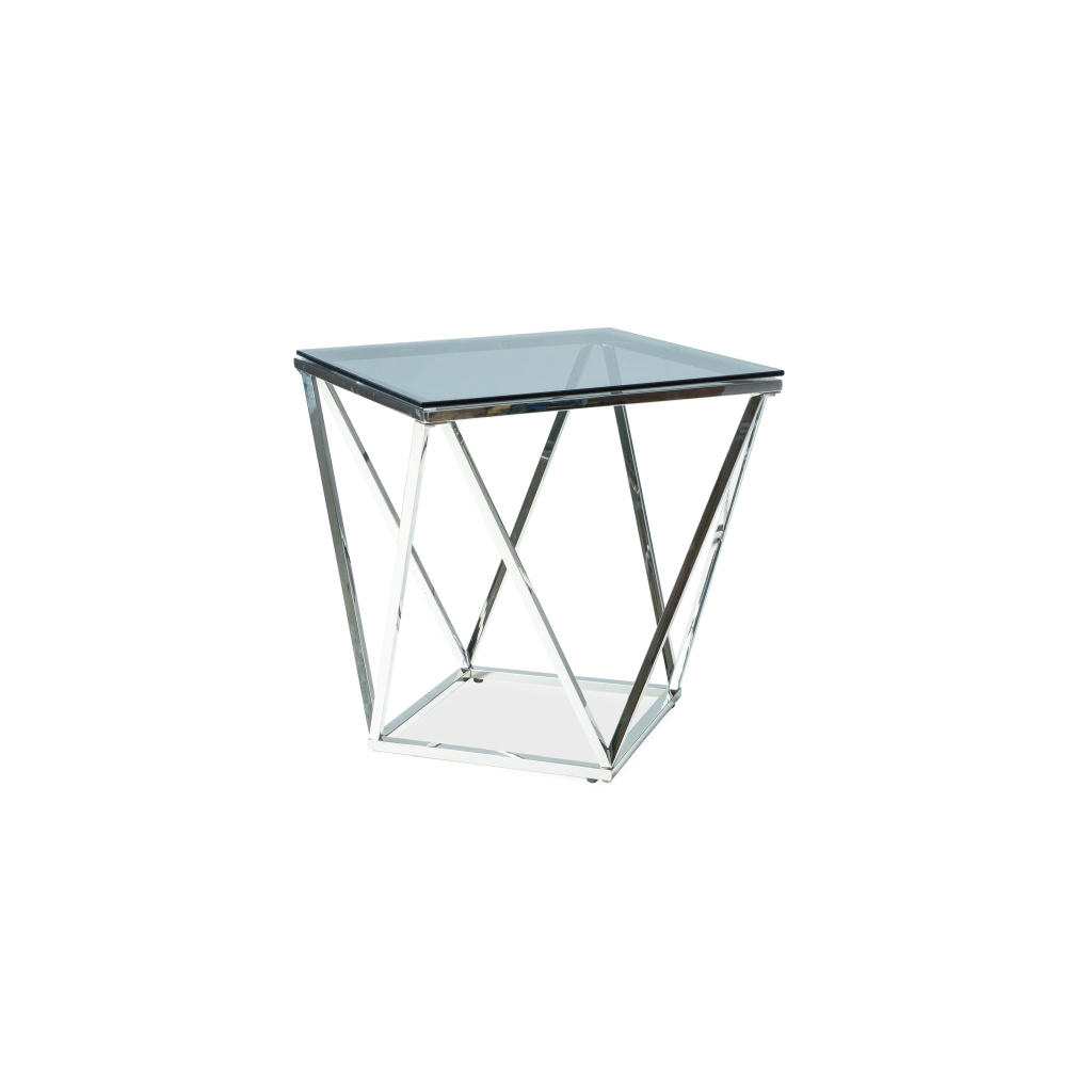 Horní deska je vyrobena z tvrzeného kouřového skla a je doplněna o podnož z oceli v barvě chromu. Podnož má specifický tvar a dodává stolku nadčasový vzhled.