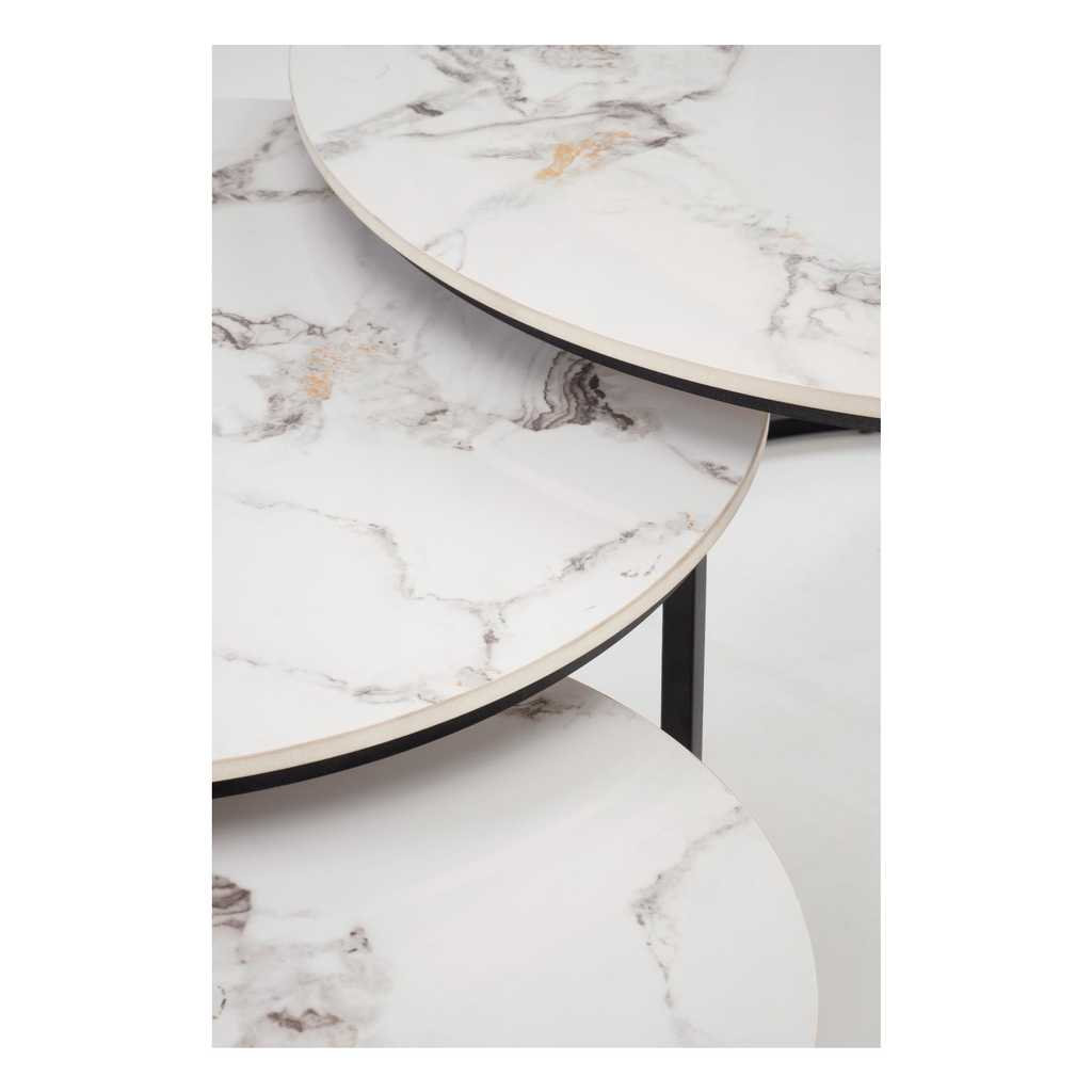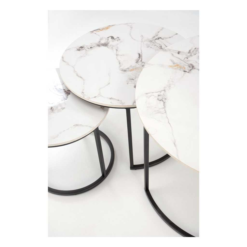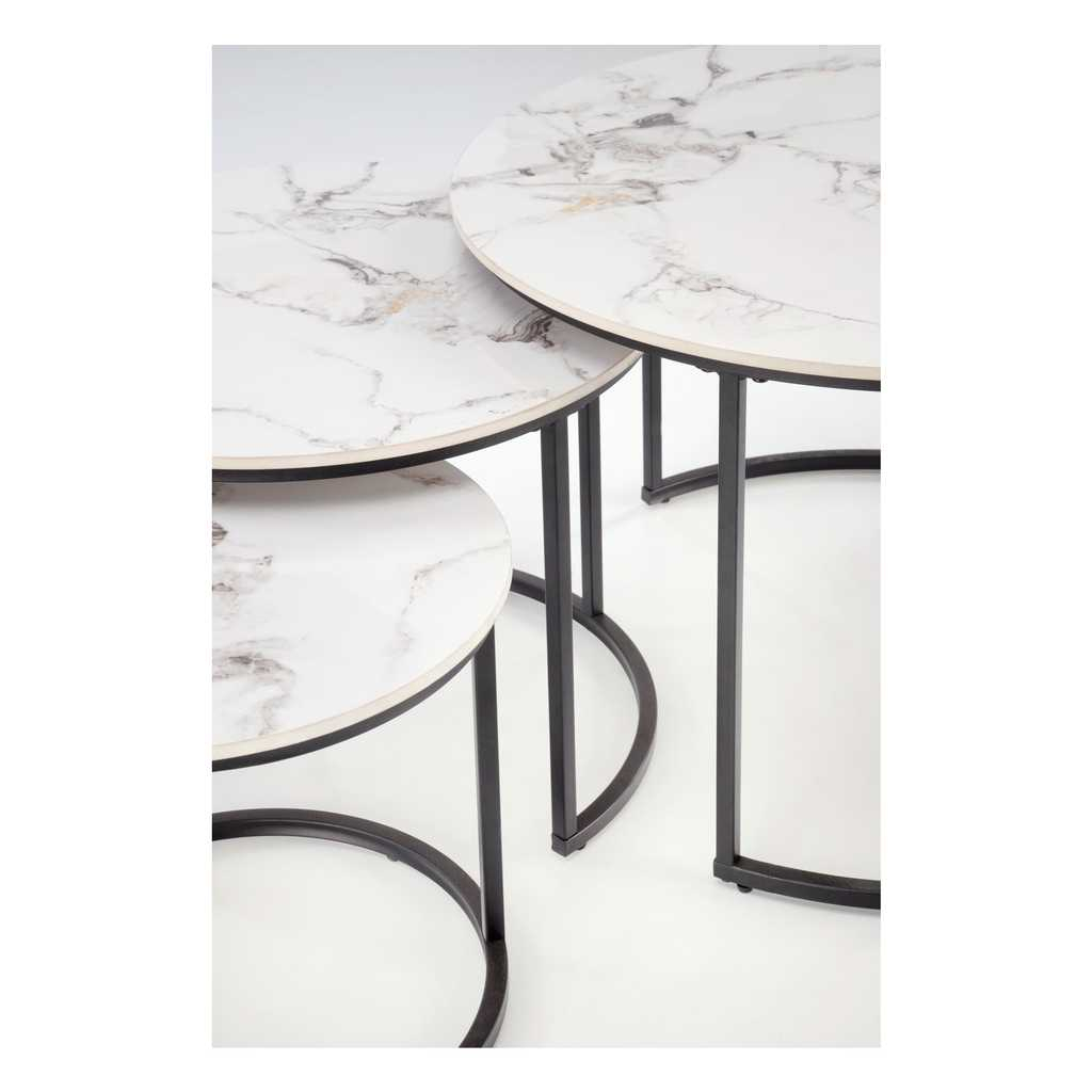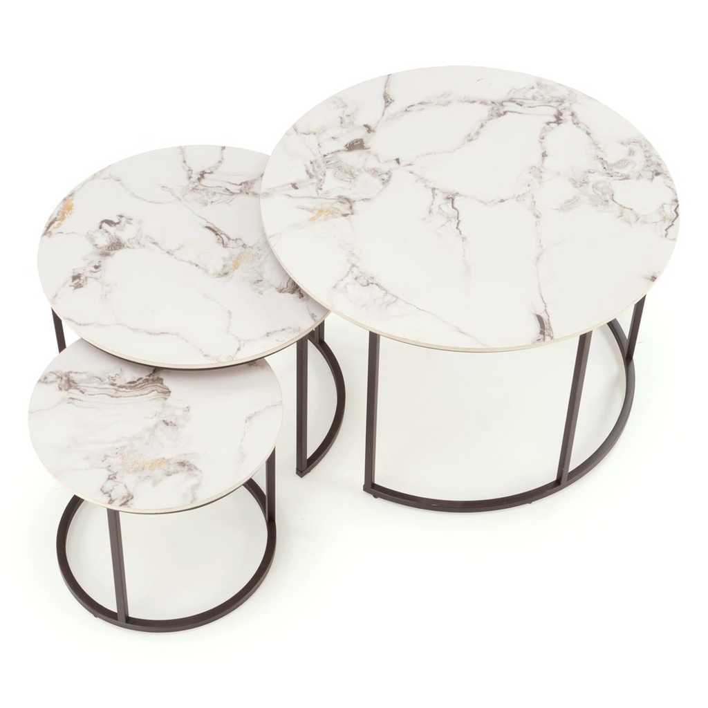 Každý stolek má kruhovou desku z umělého kamene na podnoži z práškované ocele a unese až 10 kg.
