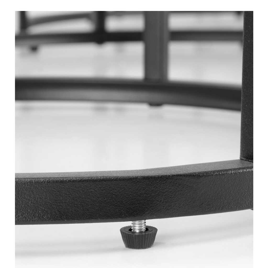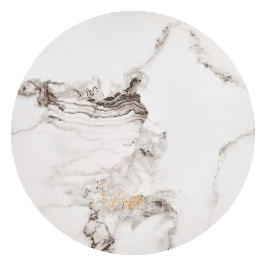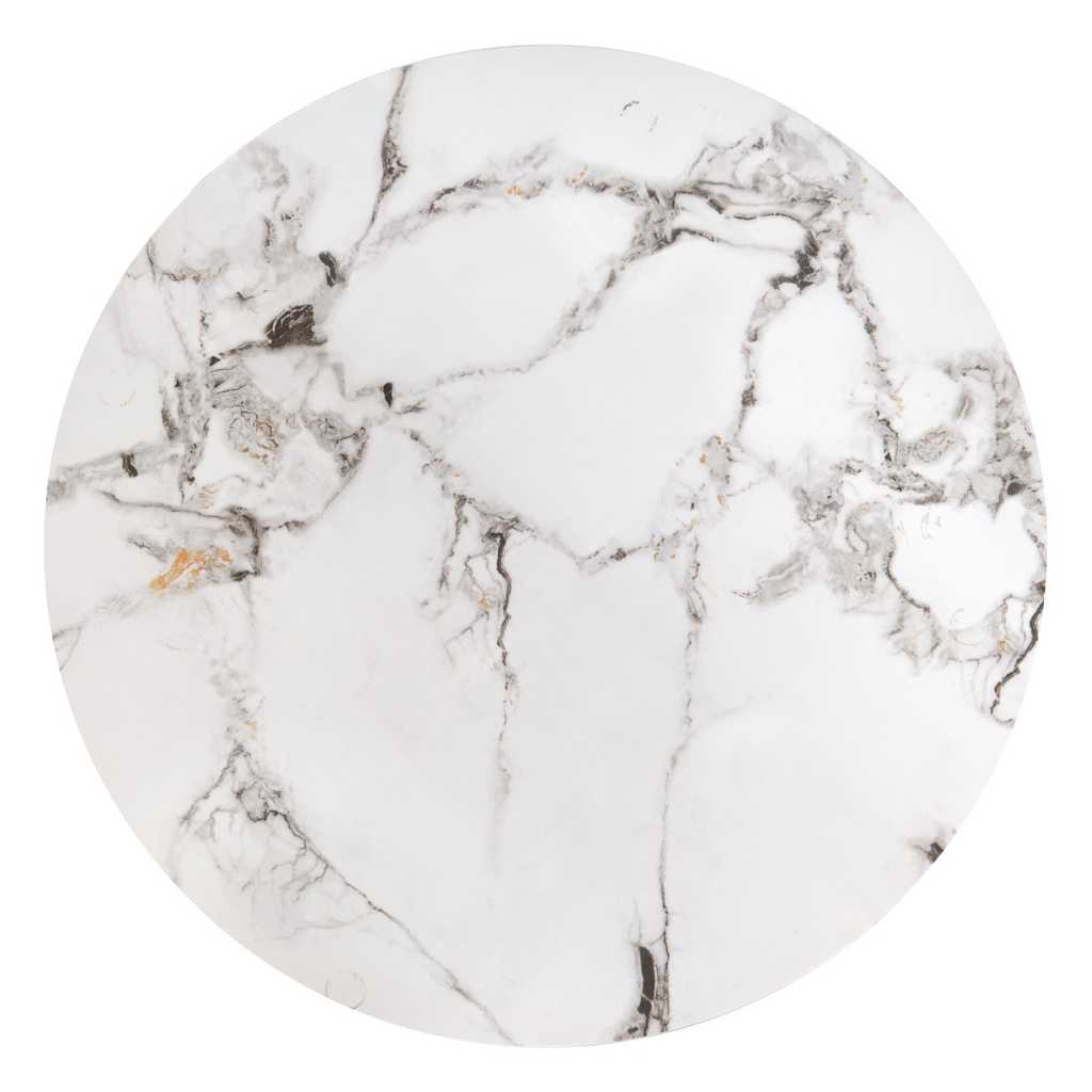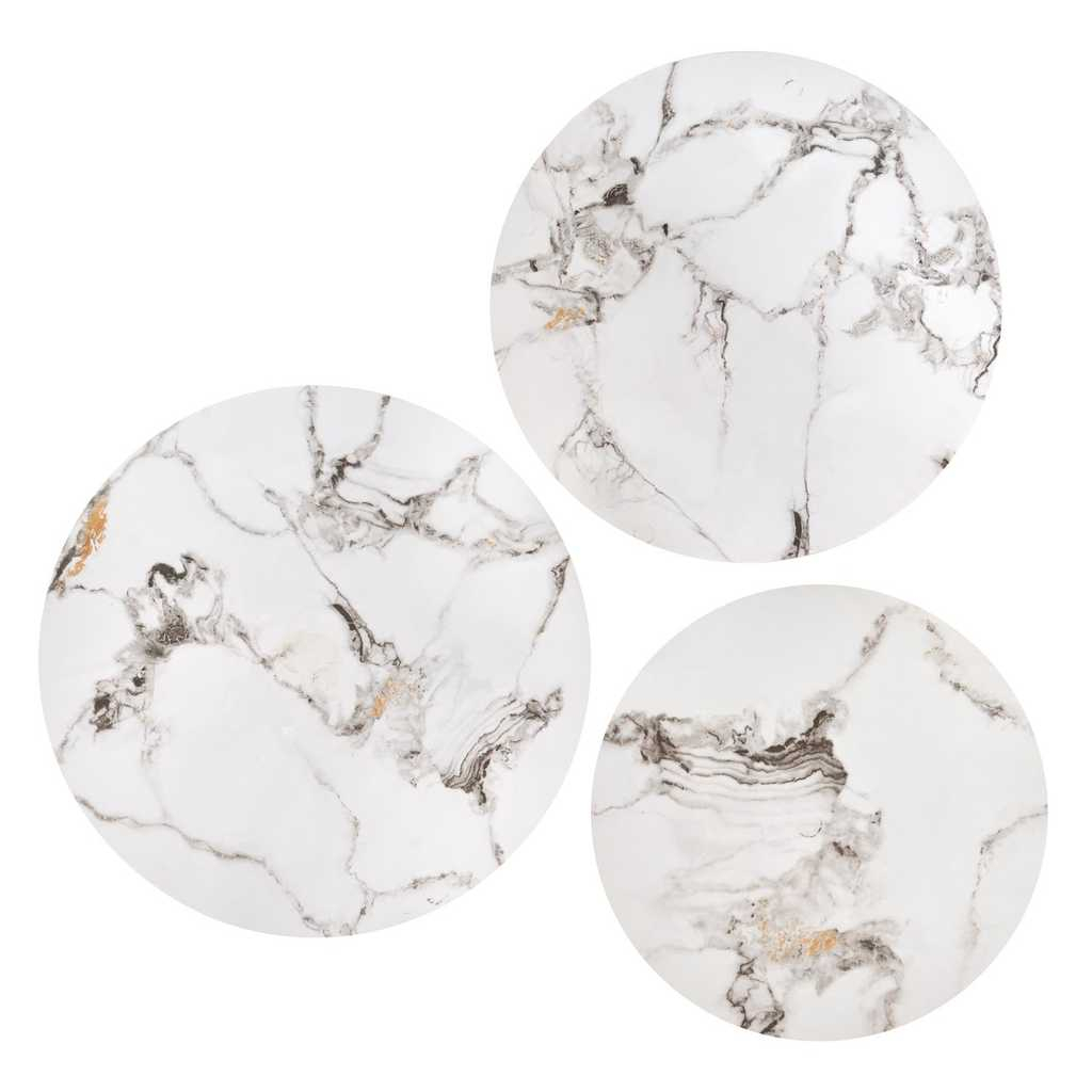 Každý stolek má kruhovou desku z umělého kamene na podnoži z práškované ocele a unese až 10 kg.