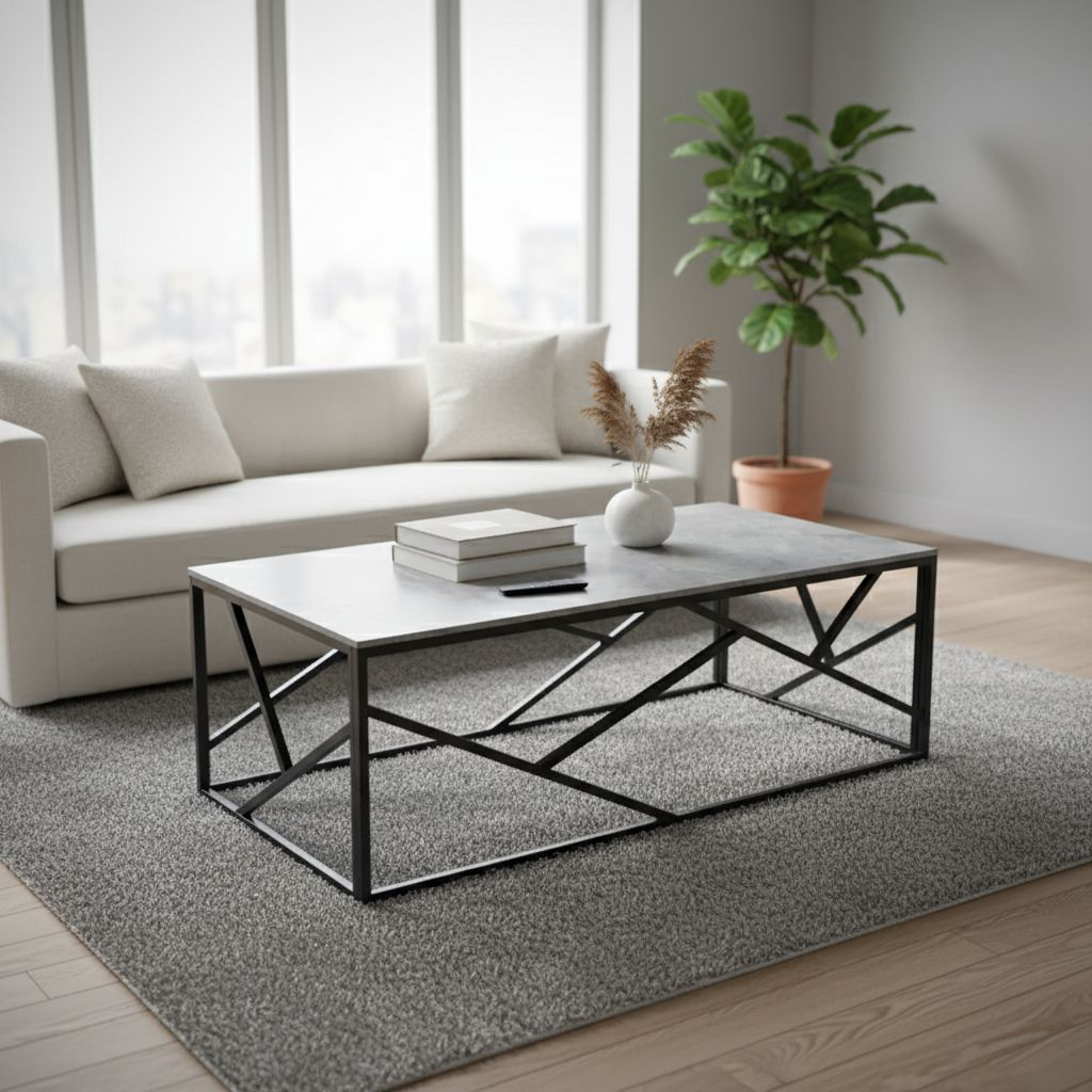 Konferenční stolek má zajímavé a originální provedení konstrukce, která je vyrobena z pevné, práškované oceli. Deska stolku je ze slinovaného kamene.