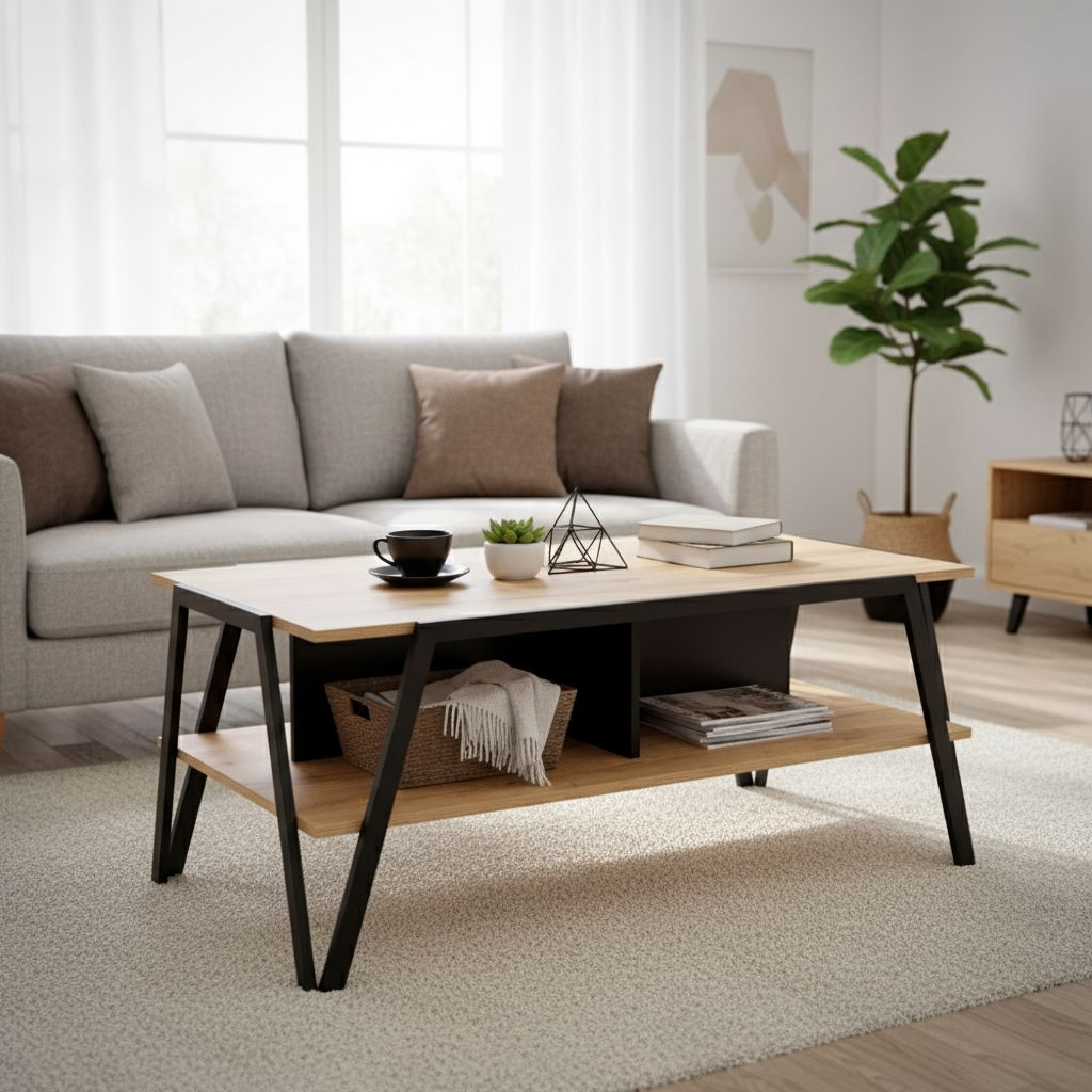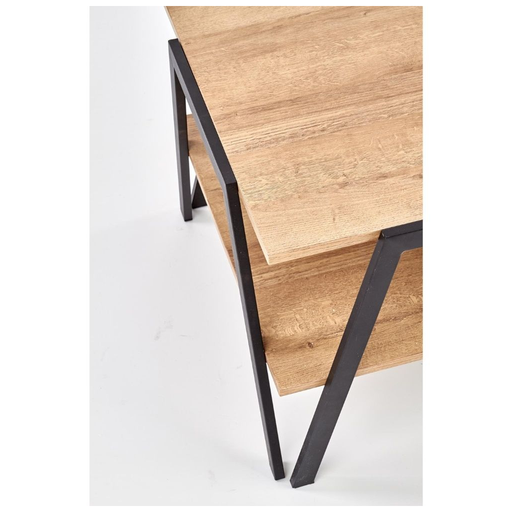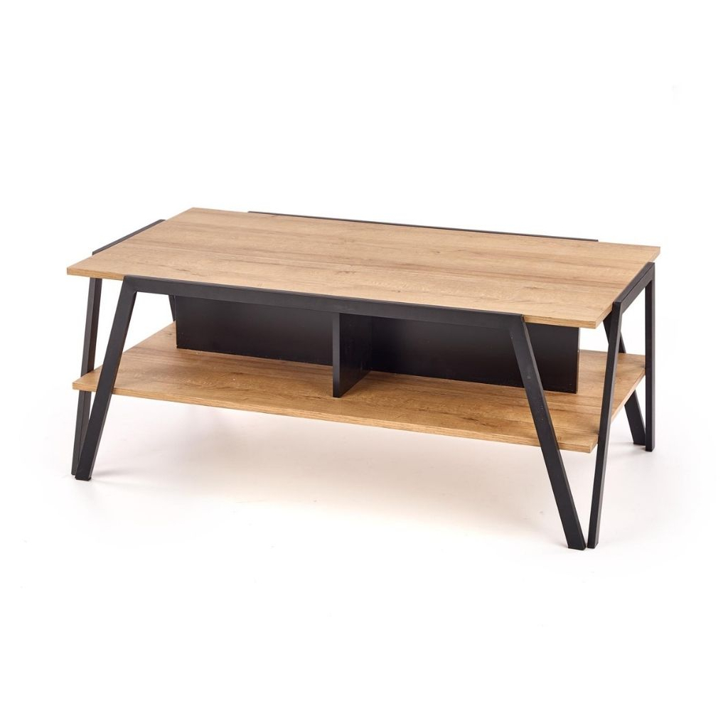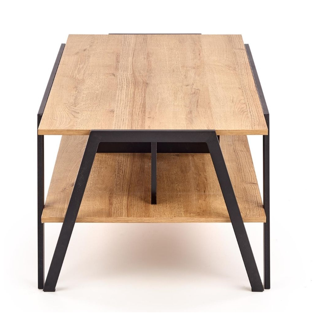 Konferenční stolek má originální, ale praktický design. Nožky stolku jsou vyrobeny z pevné práškované oceli v černé barvě. Desky stolku pak z dýhované MDF v barevném provedení dub zlatý.