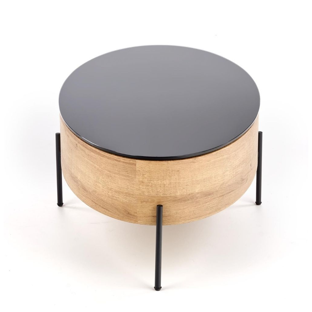 Nožky stolku jsou vyrobeny z pevné práškované oceli v černé barvě. Deska stolku je ze skla v černé barvě, boky konstrukce z dýhované MDF. Po odklopení horní desky nabízí stolek skrytý úložný prostor.