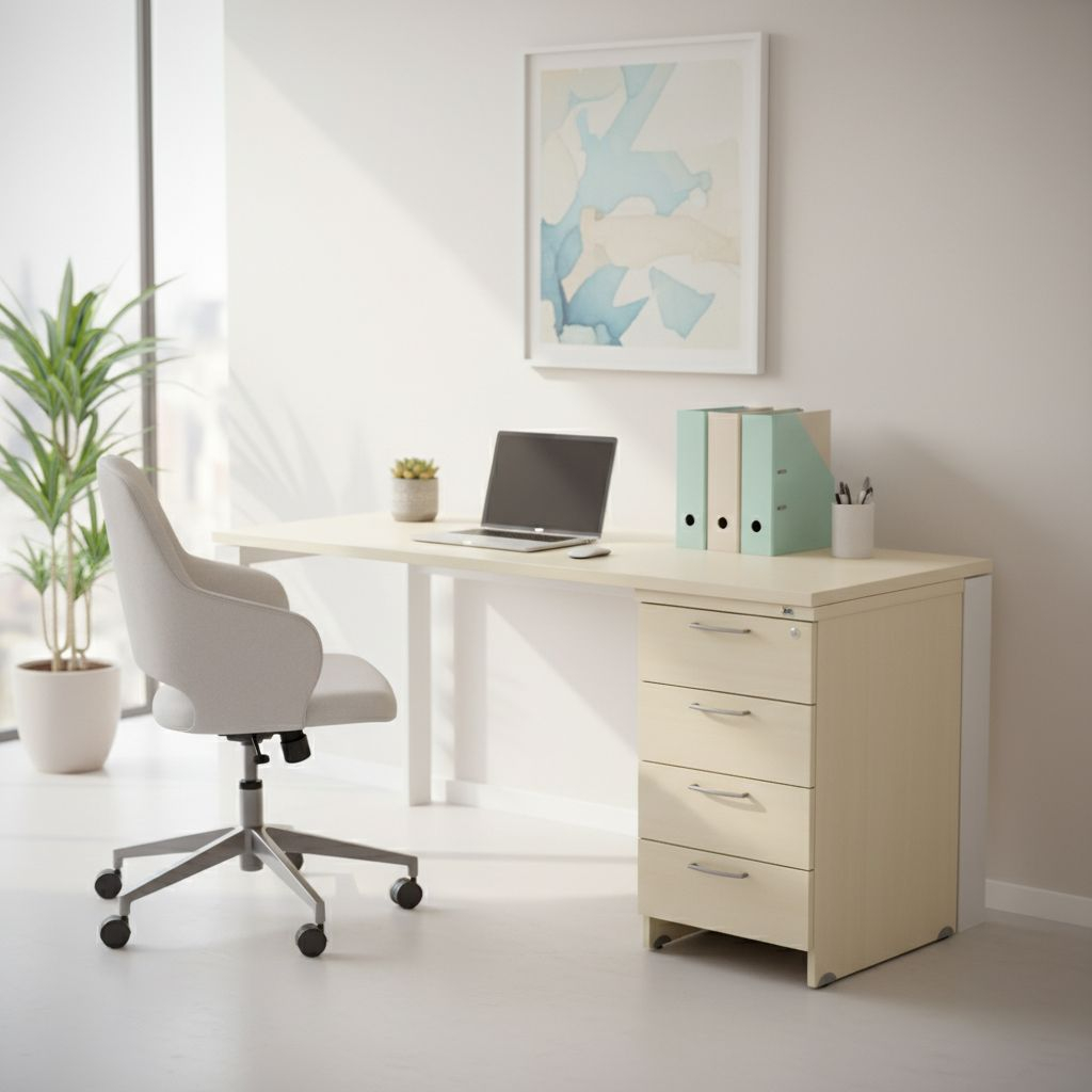 Světlé dezény, kterými jsou buk a javor, navozují příjemnou pracovní atmosféru a kancelář se díky nim zdá prostornější.