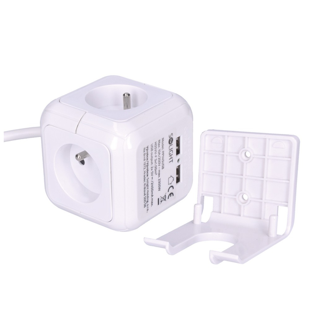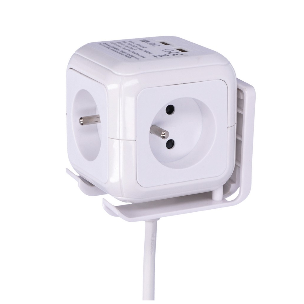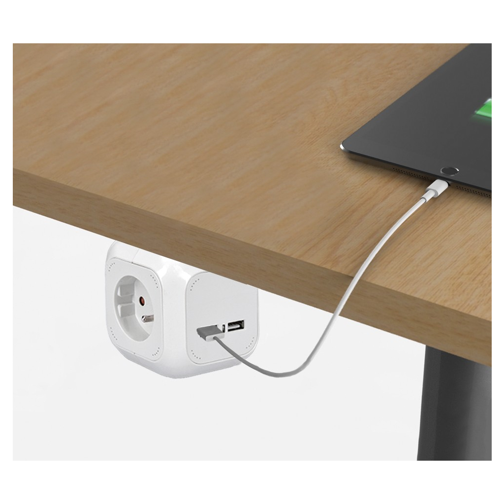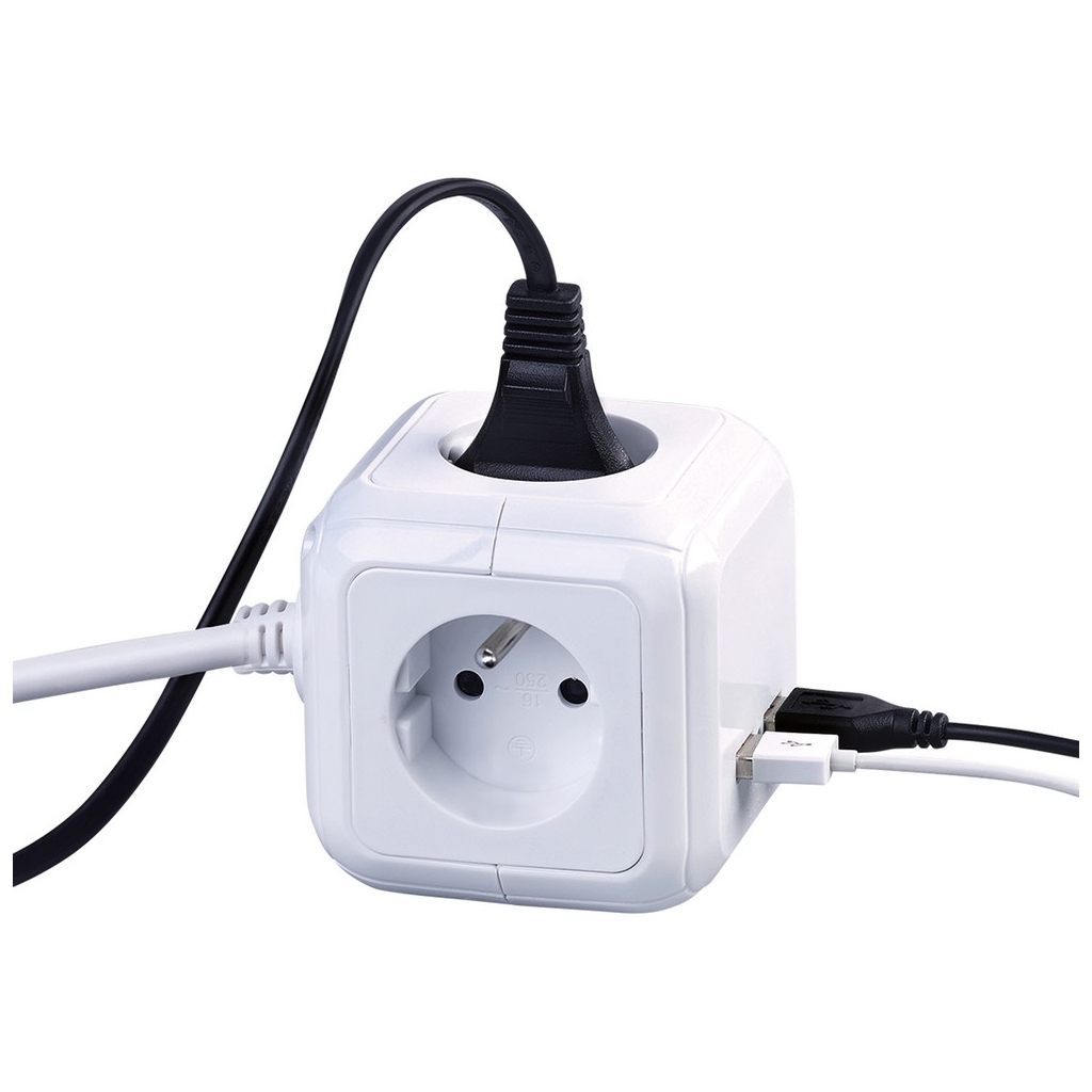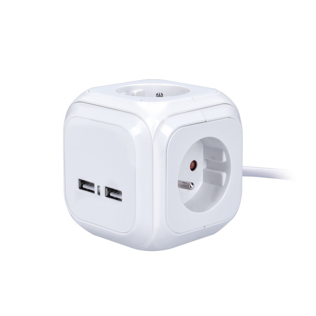 Stolní zásuvkový rozbočovač v atraktivním tvaru kostky disponuje čtyřmi zásuvkami a dvěma USB 2.0 konektory.