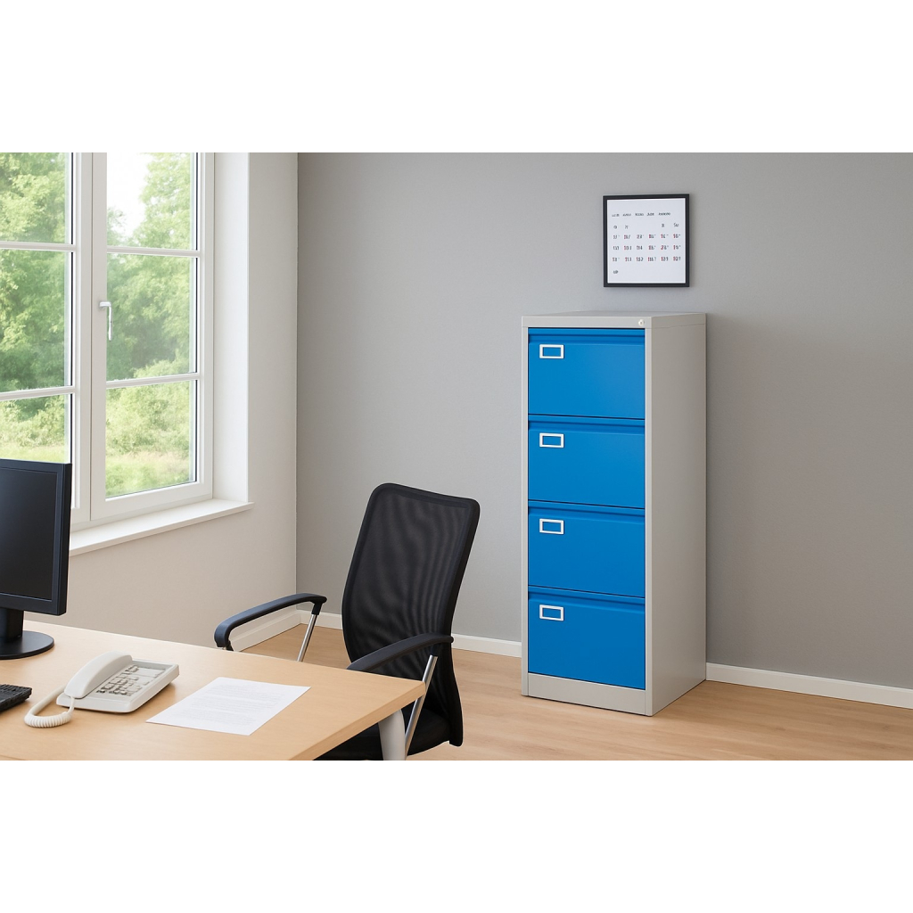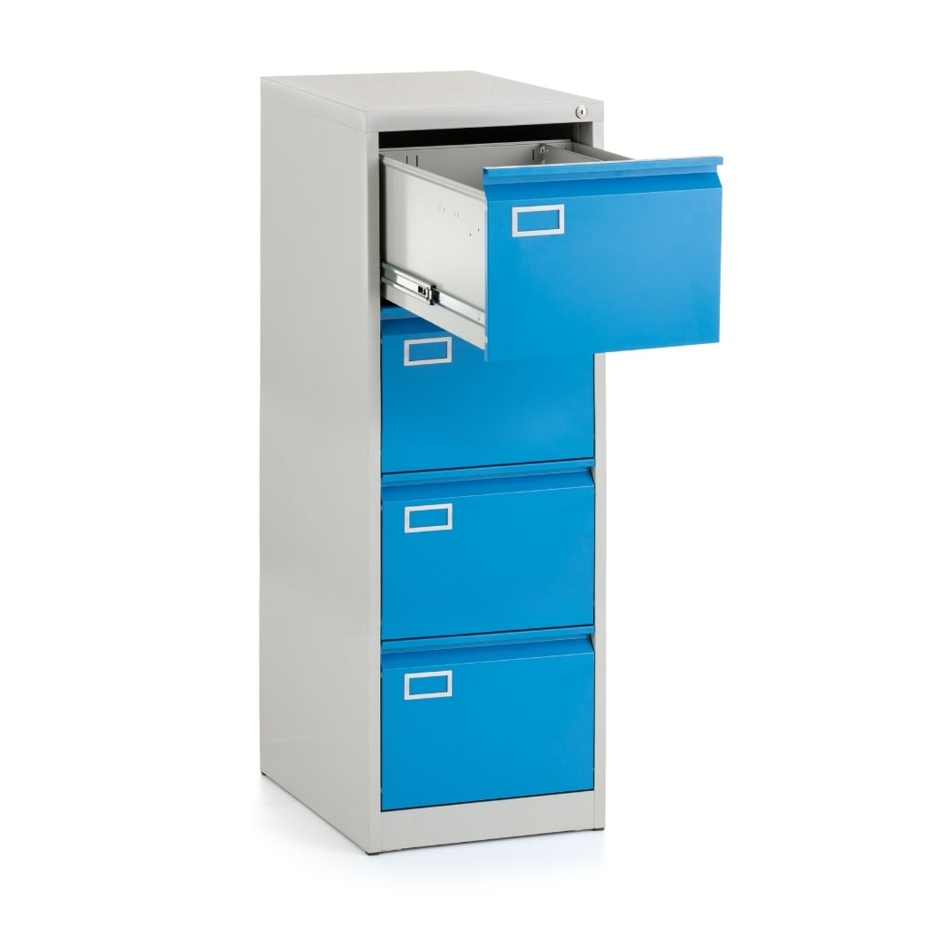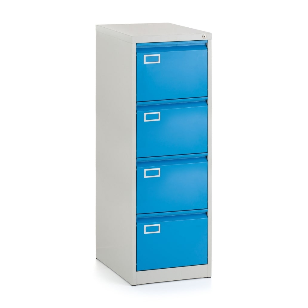 Kovová kartotéka A4 - 4 zásuvky, 45,5 x 62 x 132 cm, cylindrický zámek, modrá - ral 5012