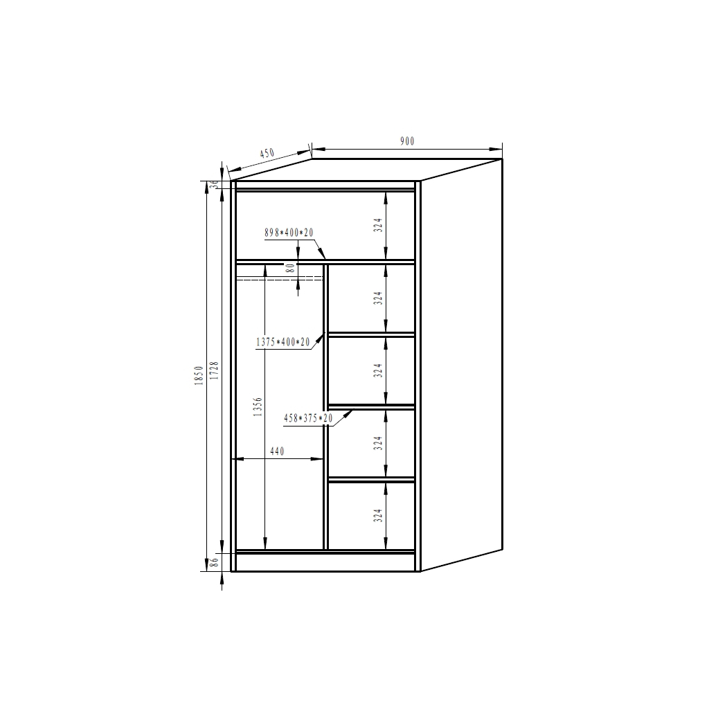 Věšák je umístěn v levé polovině skříně a je vyroben z pevného kovu. Pravá polovina skříně je vybavena 3 policemi. Každá z nich si při rovnoměrném zatížení hravě poradí s minimálně 50 kg vašich věcí. Horní police, kterou můžete zatížit stejnou nosností, je pro obě poloviny společná. Police jsou namontovány napevno, nelze si zvolit jejich výšku.
