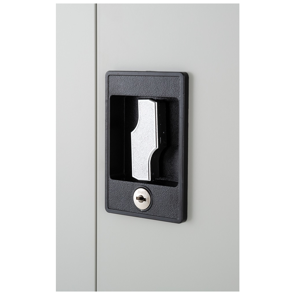 S kovovou šatní skříní se o bezpečí svých věcí nebudete muset obávat. Veškerý obsah skříně je totiž zabezpečen cylindrickým zámkem. K němu navíc dodáváme hned 2 klíče.