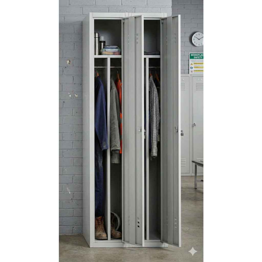 Kovová šatní dvojskříňka je pro hromadné převlékárny ideálním řešením. V prostoru se dá jednoduše připojit k jiným šatním skříním, a navíc vytvoří dostatek místa pro uložení nezbytných věcí.