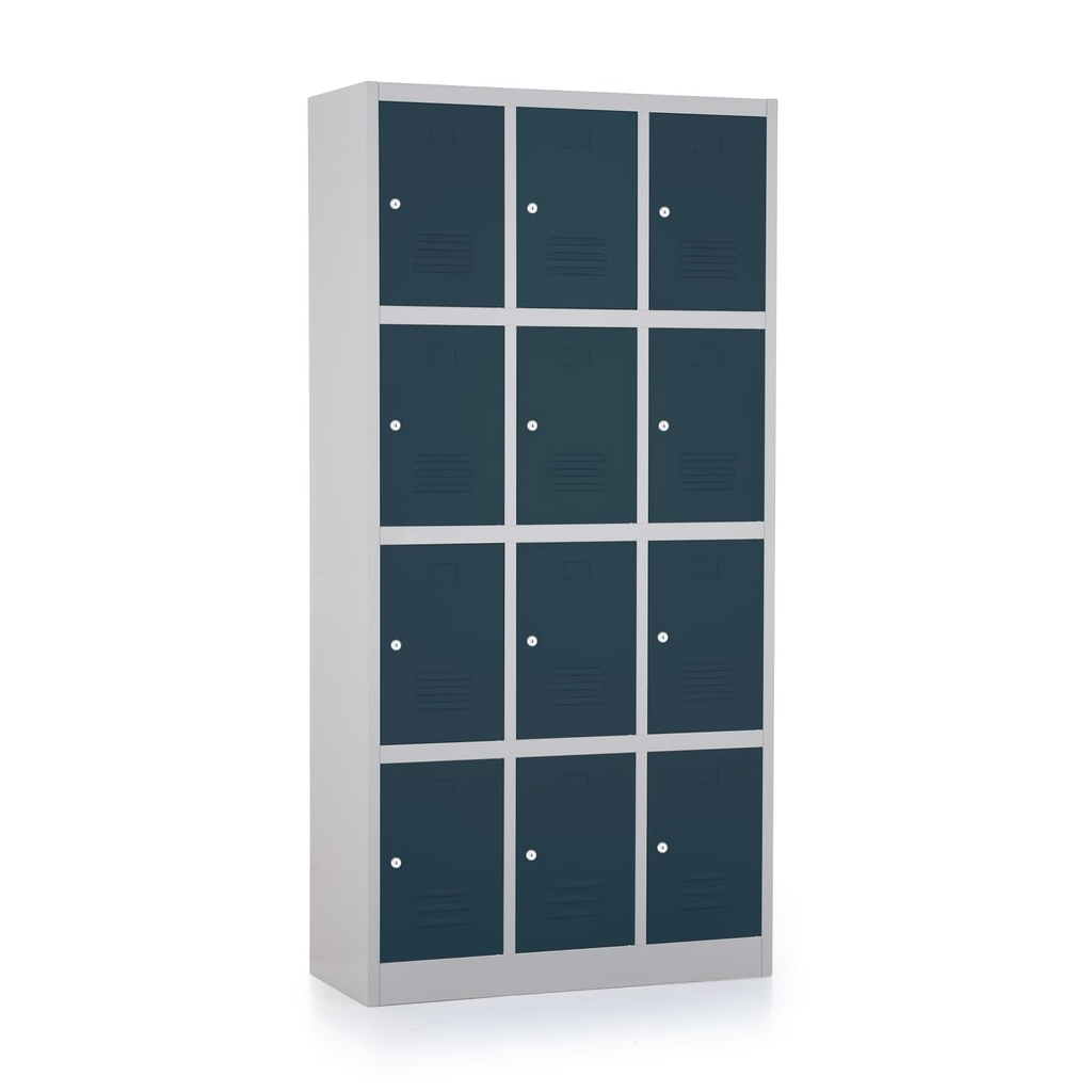 Kovová šatní skříňka disponuje 12 samostatnými boxy v rozložení 3 × 4. Každý z nich nabízí dostatek úložného prostoru pro osobní věci i oděvy.