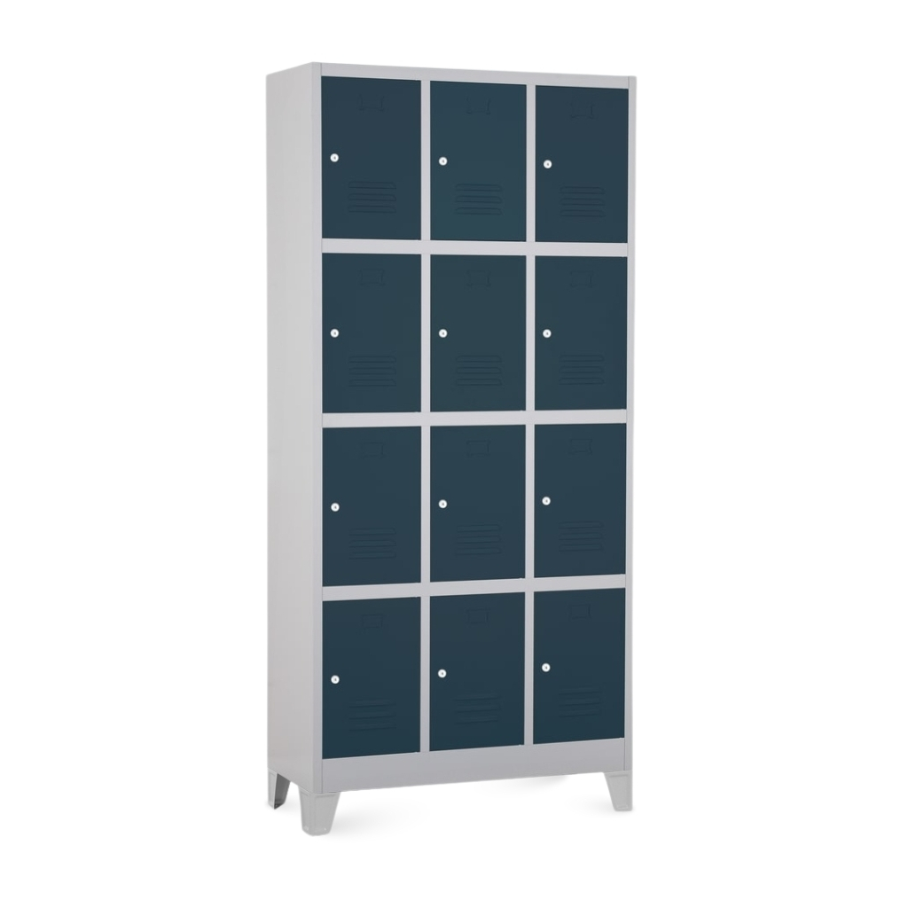 Kovová šatní skříňka disponuje 12 samostatnými boxy v rozložení 3 × 4. Každý z nich nabízí dostatek úložného prostoru pro osobní věci i oděvy.