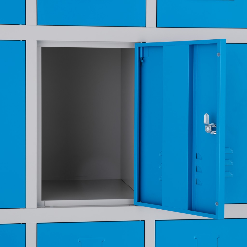 Kovová šatní skříňka disponuje 12 samostatnými boxy v rozložení 3 × 4. Každý z nich nabízí dostatek úložného prostoru pro osobní věci i oděvy.