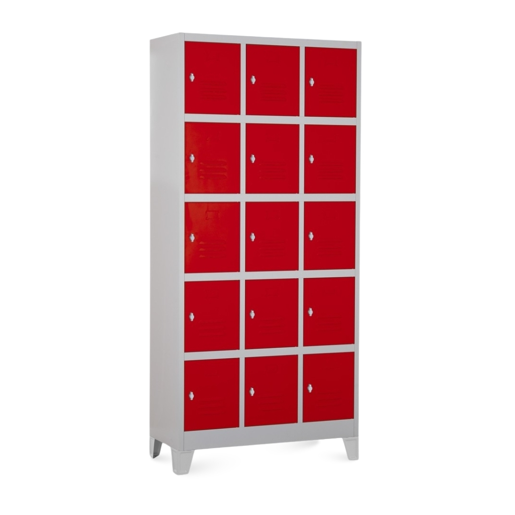 Kovová šatní skříňka disponuje 15 samostatnými boxy v rozložení 3 × 5. Každý z nich nabízí dostatek úložného prostoru pro osobní věci i oděvy.