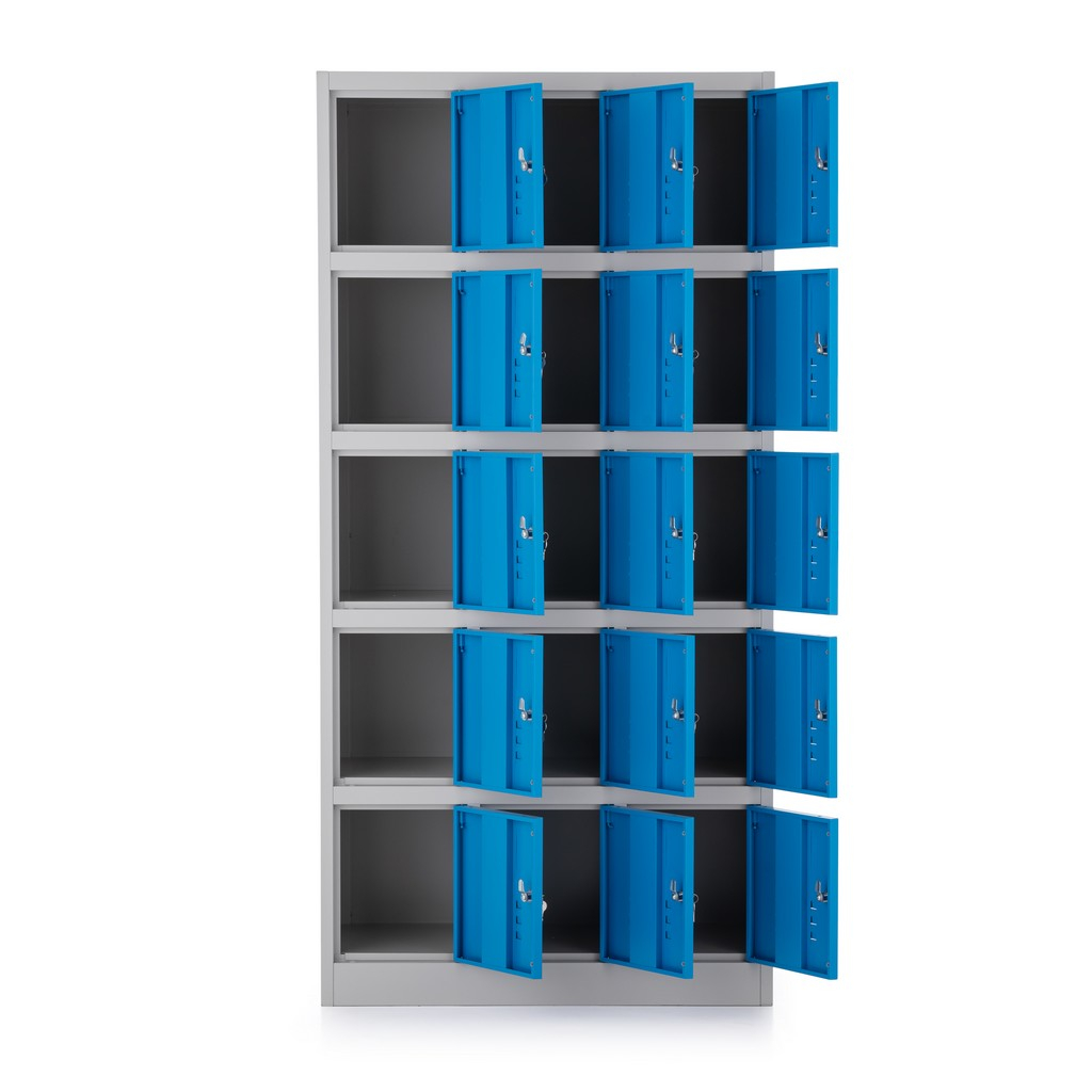 Kovová šatní skříňka disponuje 15 samostatnými boxy v rozložení 3 × 5. Každý z nich nabízí dostatek úložného prostoru pro osobní věci i oděvy.
