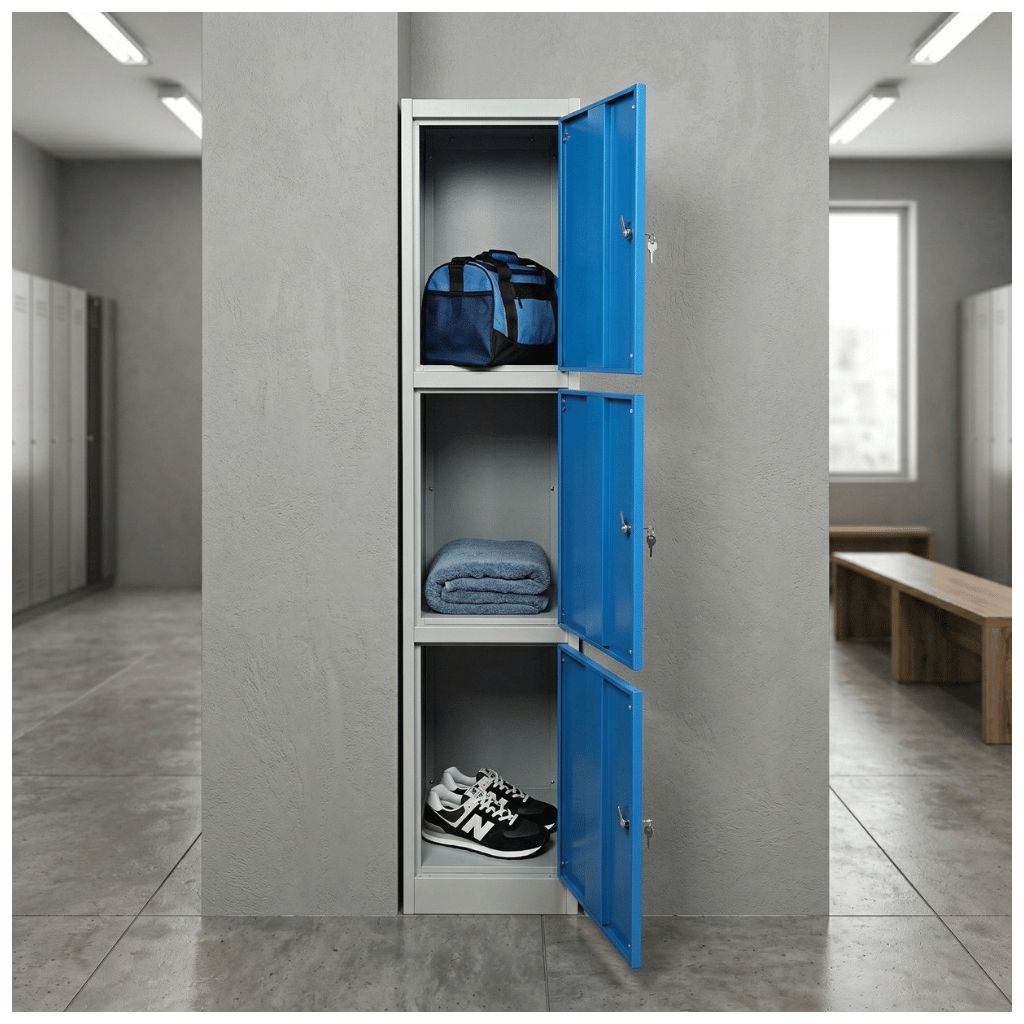 Kovová šatní skříňka disponuje 3 samostatnými boxy umístěnými na sobě. Každý z nich nabízí dostatek úložného prostoru pro osobní věci i oděvy.