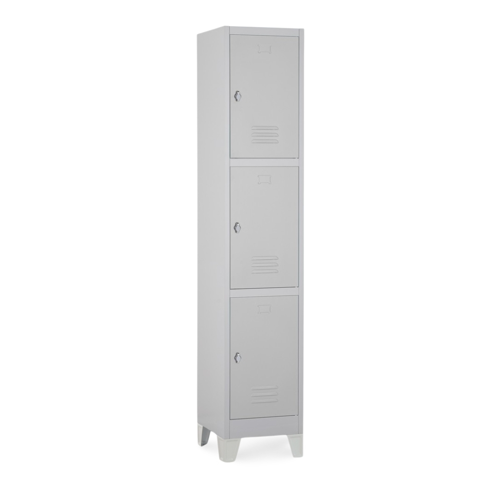 Kovová šatní skříňka disponuje 3 samostatnými boxy umístěnými na sobě. Každý z nich nabízí dostatek úložného prostoru pro osobní věci i oděvy.