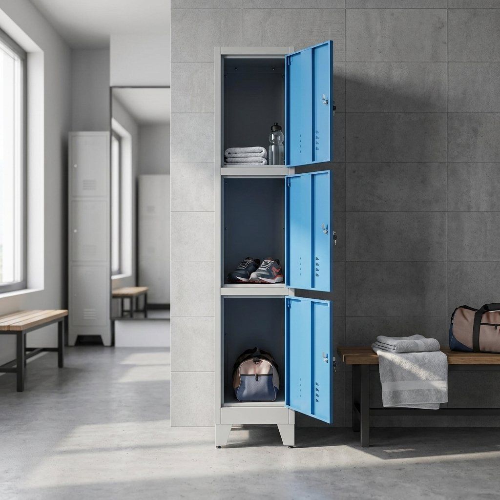 Kovová šatní skříňka disponuje 3 samostatnými boxy umístěnými na sobě. Každý z nich nabízí dostatek úložného prostoru pro osobní věci i oděvy.