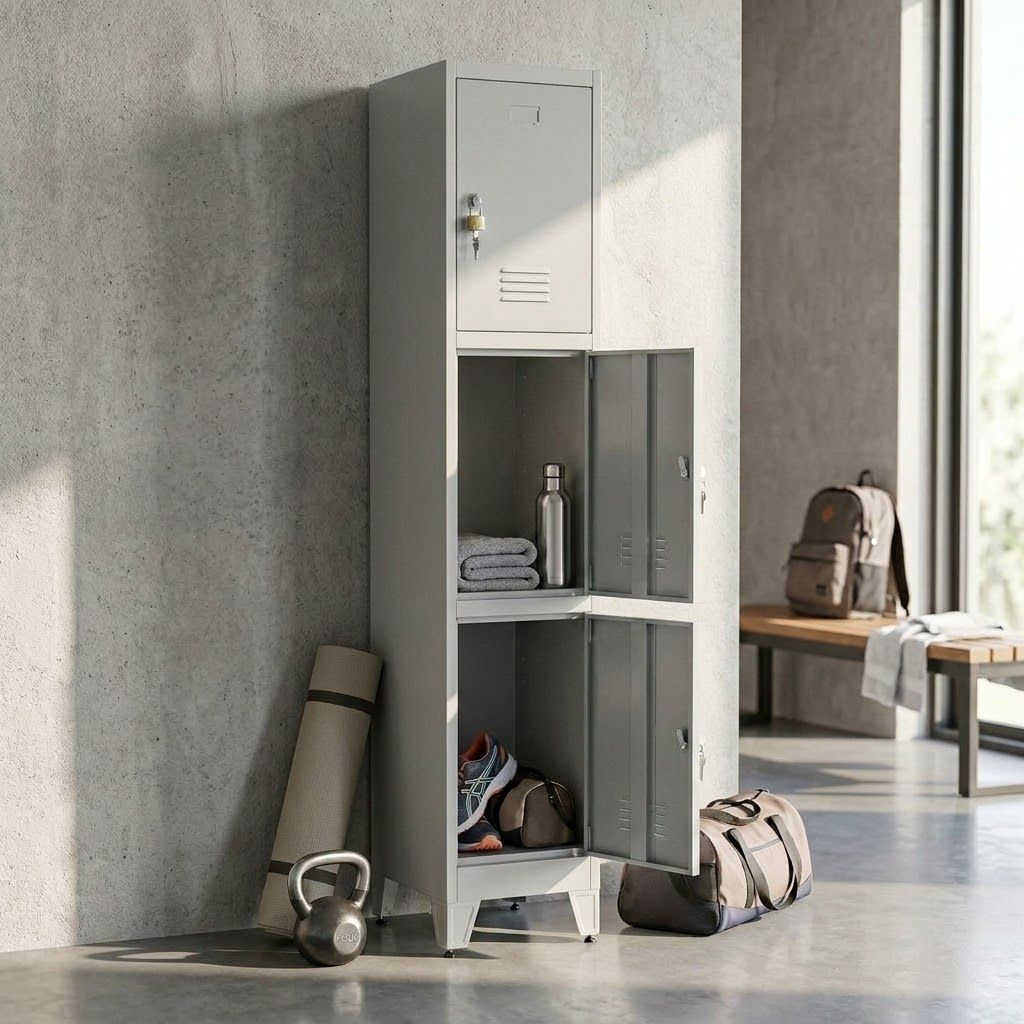 Kovová šatní skříňka disponuje 3 samostatnými boxy umístěnými na sobě. Každý z nich nabízí dostatek úložného prostoru pro osobní věci i oděvy.