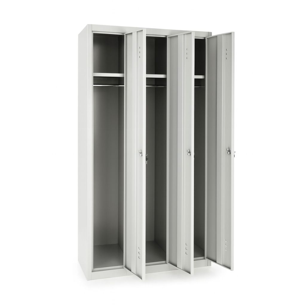 Kovová šatní trojskříňka je pro hromadné převlékárny ideálním řešením. V prostoru se dá jednoduše připojit k jiným šatním skříňkám, a navíc vytvoří dostatek místa pro uložení nezbytných věcí.