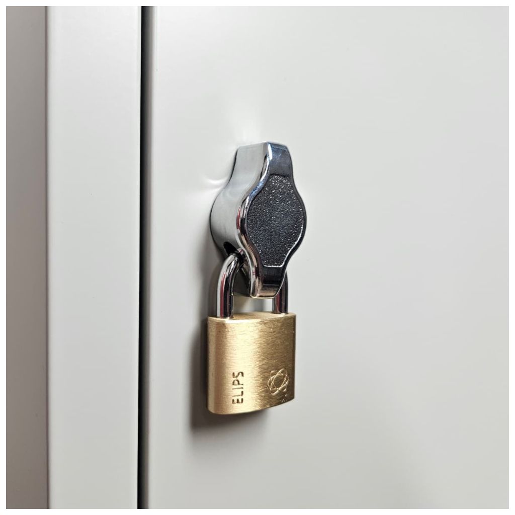 S kovovou šatní skříňkou se o bezpečí svých věcí nebudete muset obávat. Veškerý obsah každé ze skříněk je totiž zabezpečen otočným zámkem, který je přizpůsobený pro vložení vlastního visacího zámku.