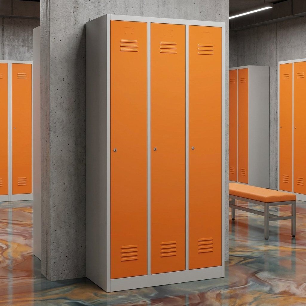 Kovová šatní skříňka - 3 oddíly, 90 x 50 x 180 cm, cylindrický zámek, oranžová - ral 2004