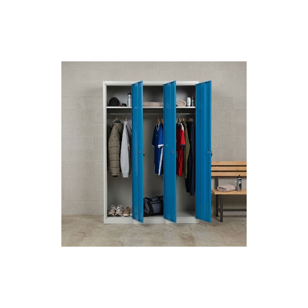 Kovová šatní trojskříňka je pro hromadné převlékárny ideálním řešením. V prostoru se dá jednoduše připojit k jiným šatním skříňkám, a navíc vytvoří dostatek místa pro uložení nezbytných věcí.