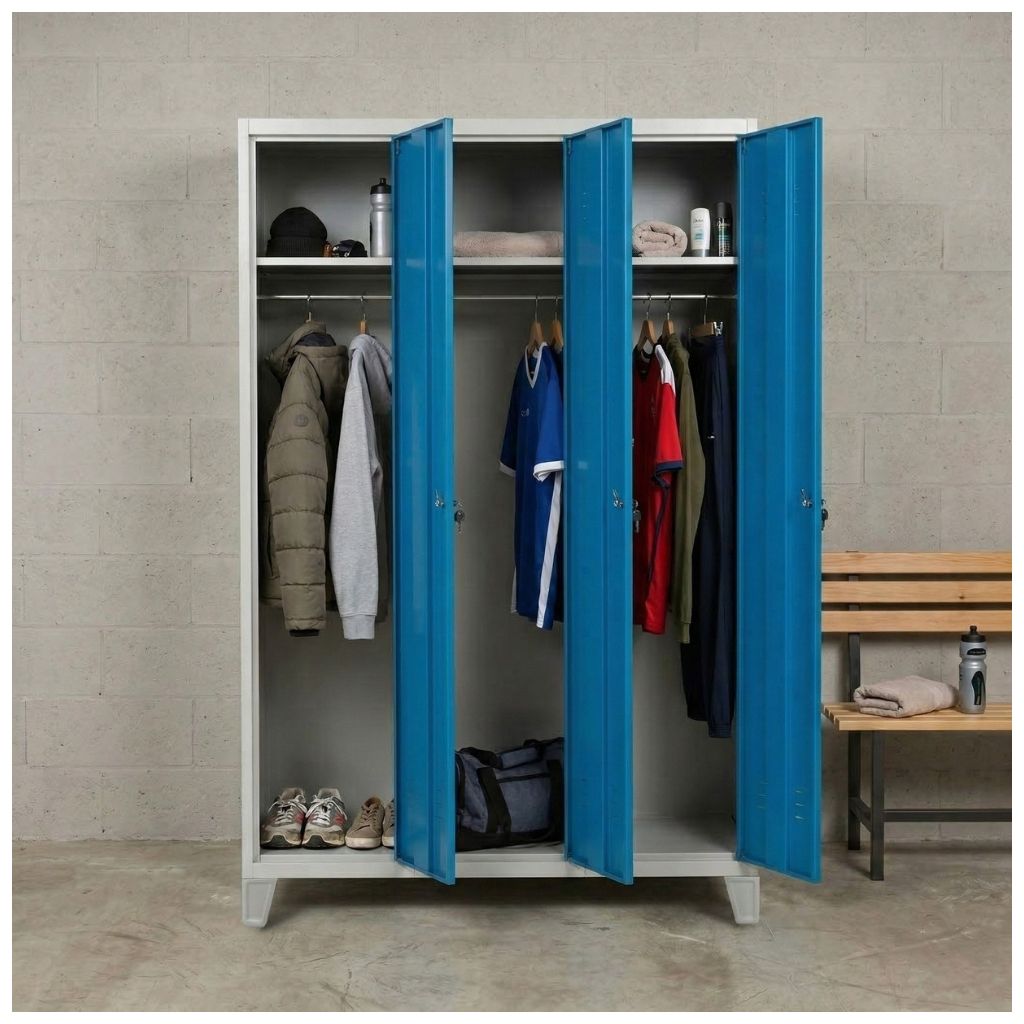 Kovová šatní trojskříňka je pro hromadné převlékárny ideálním řešením. V prostoru se dá jednoduše připojit k jiným šatním skříňkám, a navíc vytvoří dostatek místa pro uložení nezbytných věcí.