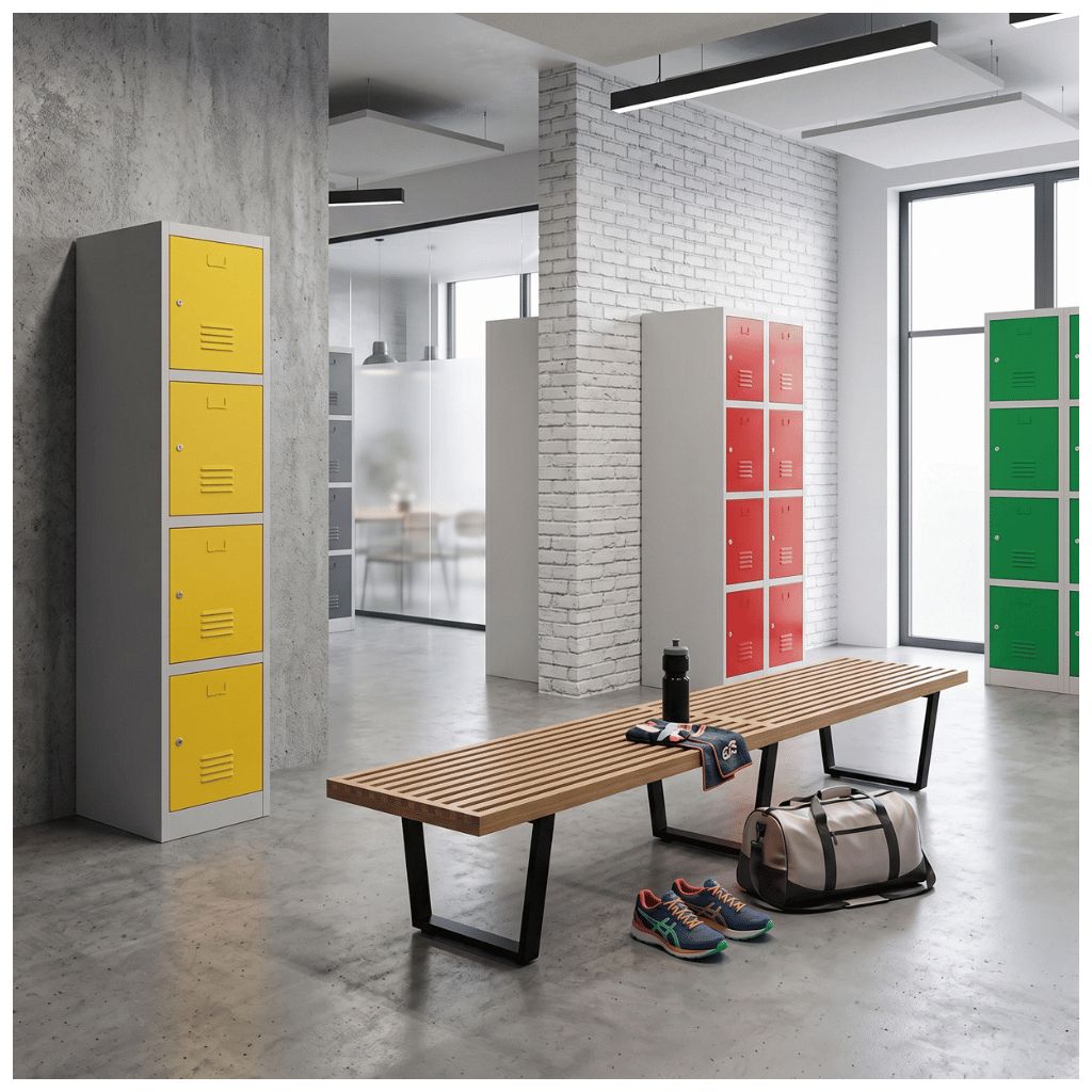 Kovová šatní skříňka disponuje 4 samostatnými boxy umístěnými na sobě. Každý z nich nabízí dostatek úložného prostoru pro osobní věci i oděvy.