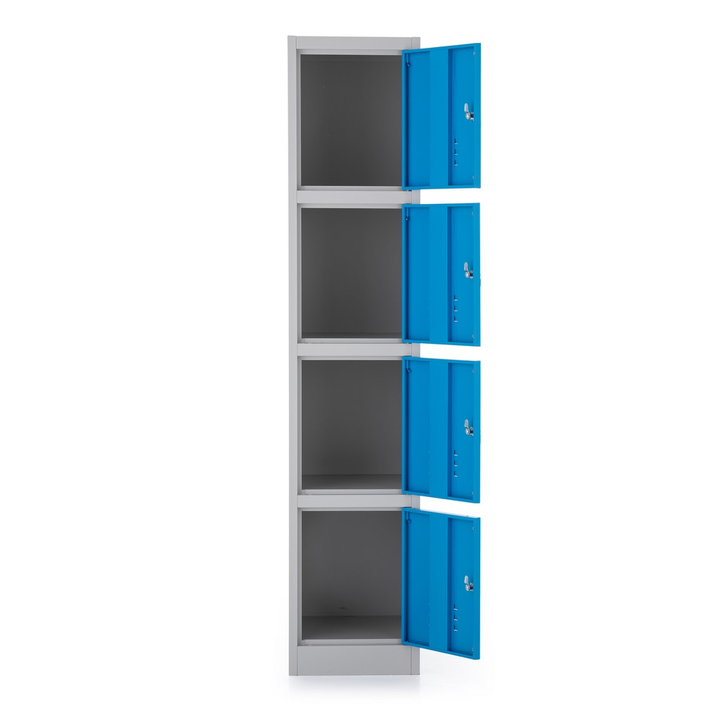 Kovová šatní skříňka disponuje 4 samostatnými boxy umístěnými na sobě. Každý z nich nabízí dostatek úložného prostoru pro osobní věci i oděvy.