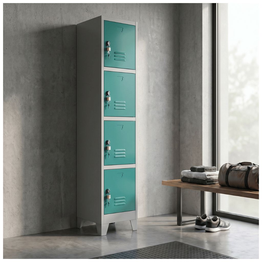 Kovová šatní skříňka disponuje 4 samostatnými boxy umístěnými na sobě. Každý z nich nabízí dostatek úložného prostoru pro osobní věci i oděvy.